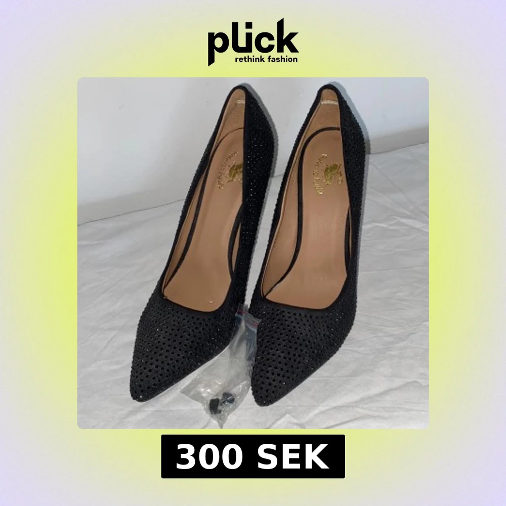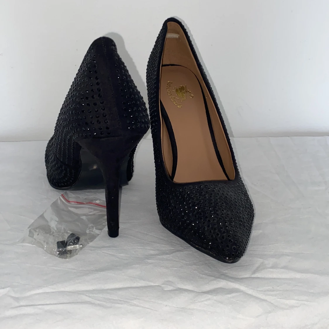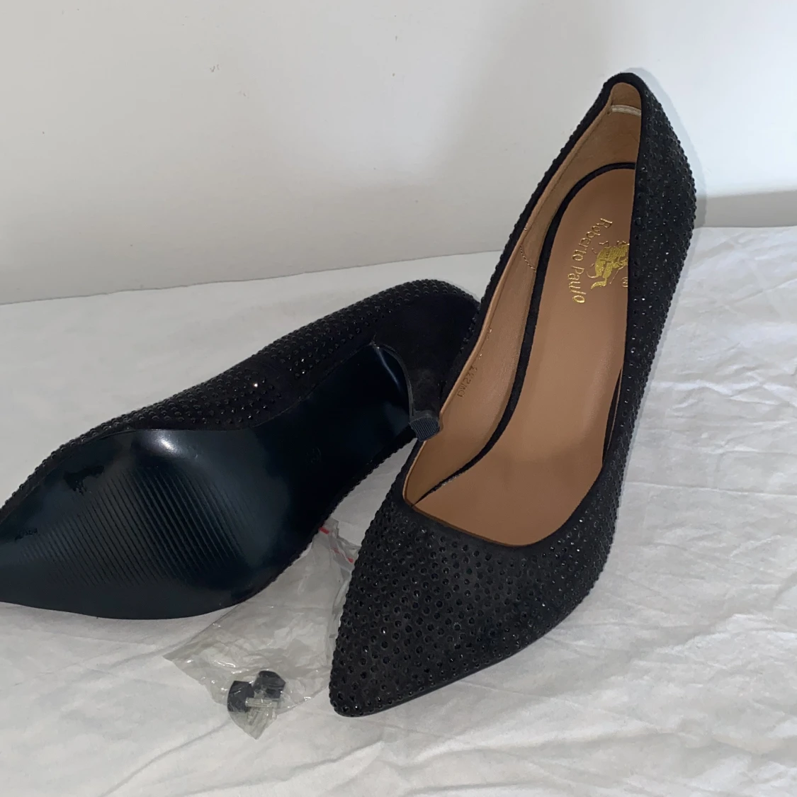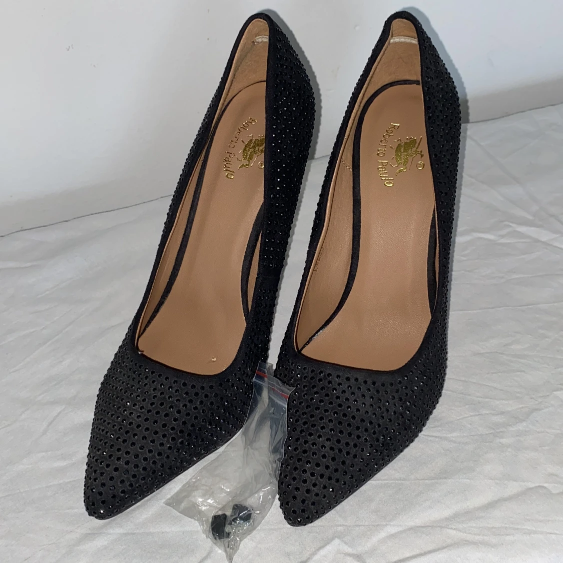 Snygga svarta pumps från Roberto Paulo med spetsig tå och hög klack. Skorna är täckta av små svarta strasstenar som ger en glittrig look. Utsidan är i mocka och insidan i beige syntet. Perfekta för dig som vill sticka ut med stil.