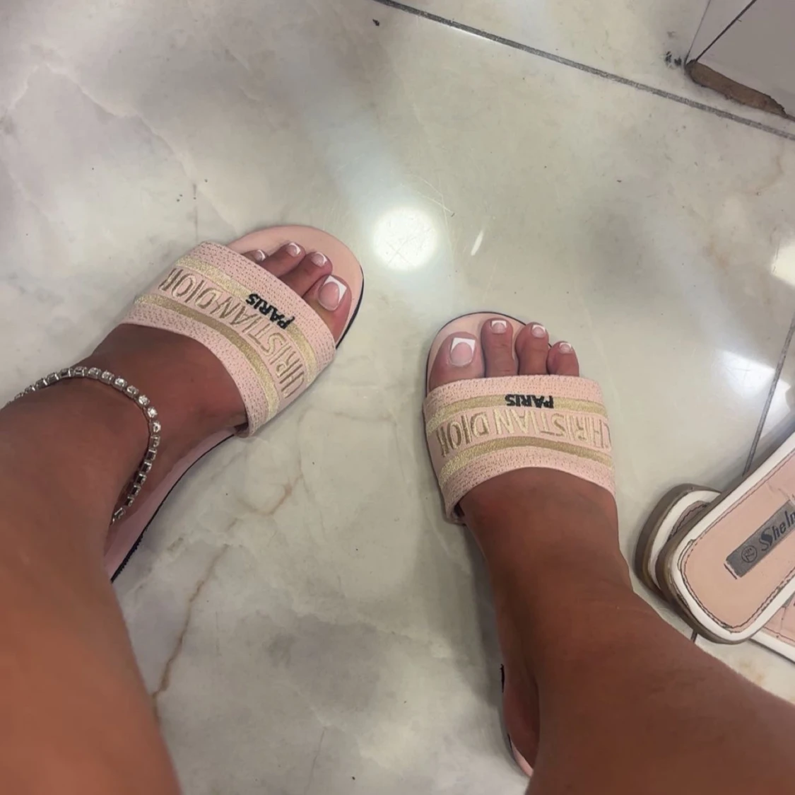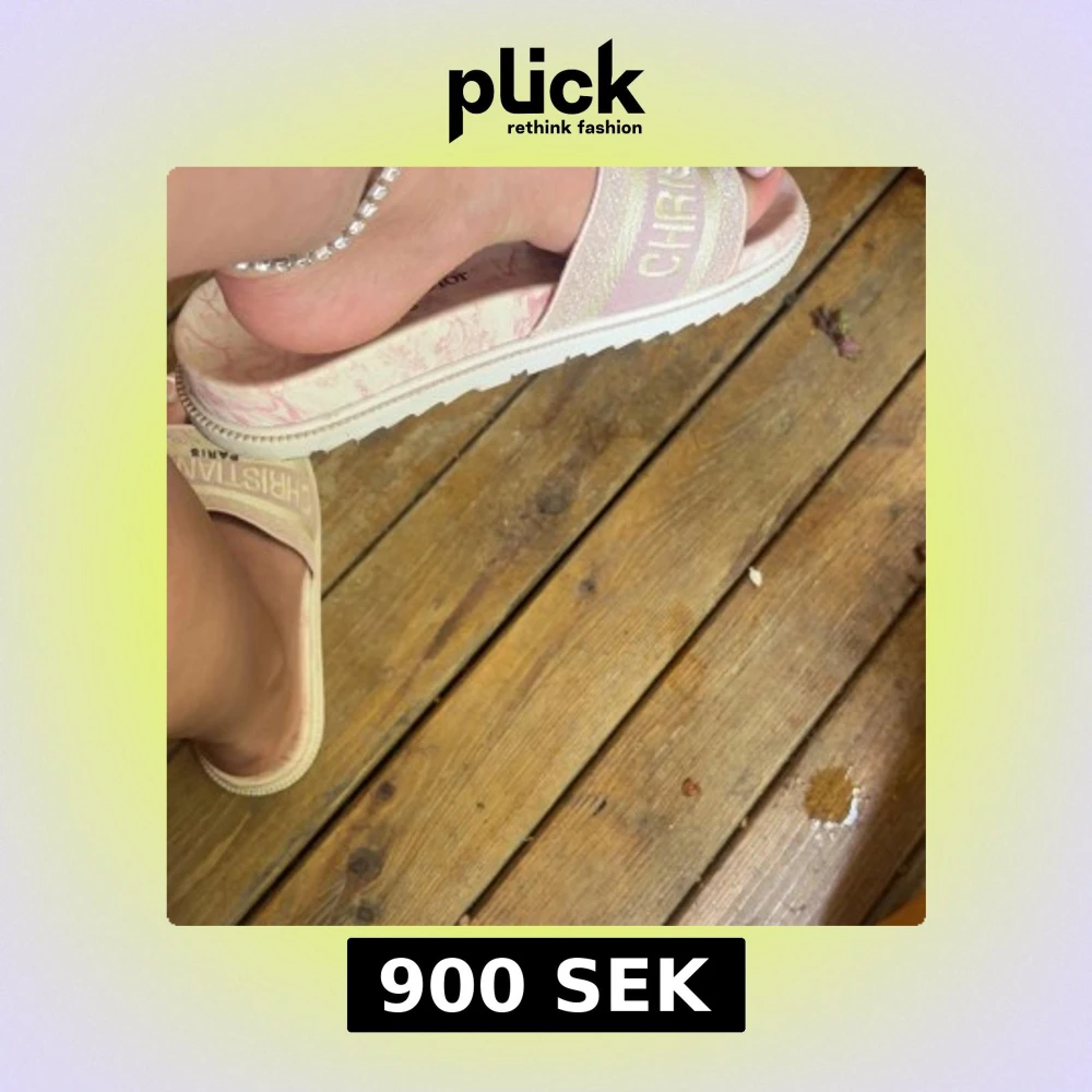 Snygga sandaler, ljusrosa toner med bred rem där loggan är broderad i guld. Tjock sula med vit kant och öppen tå. Perfekta för sommardagar och ger en lyxig touch till din outfit.