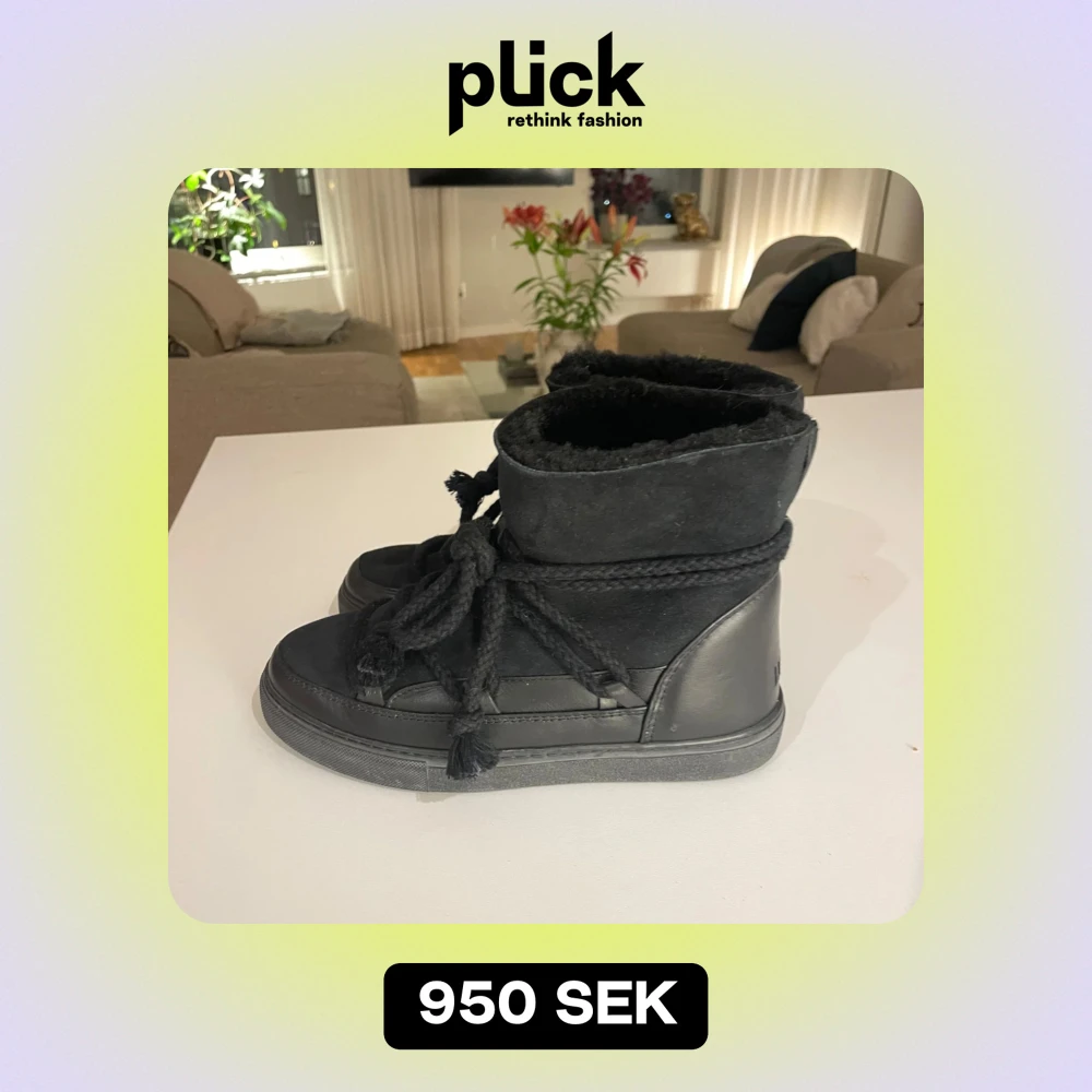 Säljer ett par svarta boots från Inuikii i skinn och mocka. De har en mysig pälsfodring och snörning framtill. Perfekta för kalla vinterdagar med sin varma och bekväma passform. Använd dem för en stilren look i vinter!