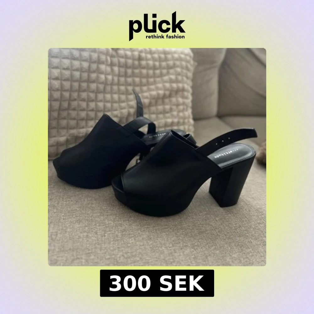 Säljer ett par svarta klackskor med öppen tå och bred klack. Skorna har en platåsula och justerbar rem runt hälen. Perfekta för dig som vill ha både höjd och stabilitet i steget.