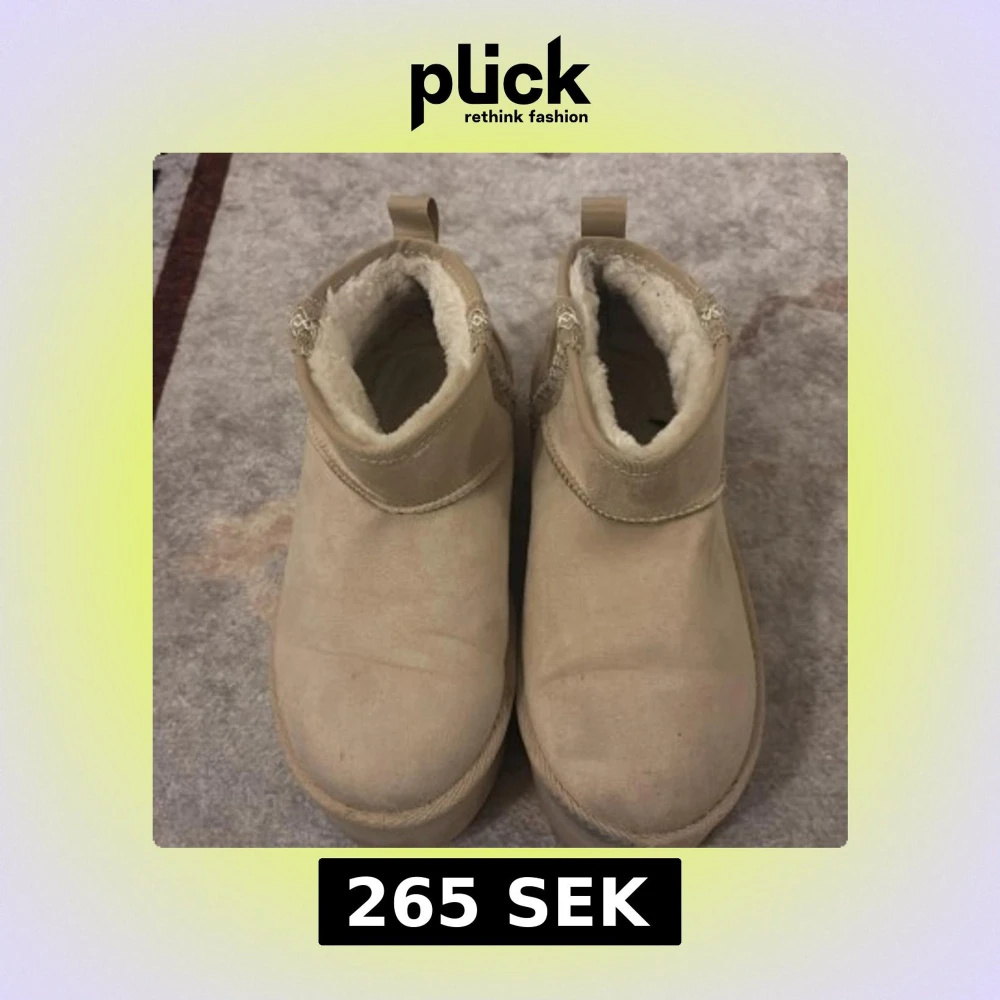 Säljer ett par beige boots med platt sula och plattform. Skorna har rund tå och är fodrade med mjukt syntetpäls för extra värme. Utsidan är i mocka och de har dekorativa band på sidan. Perfekta för kalla dagar och har en enkel, stilren look.