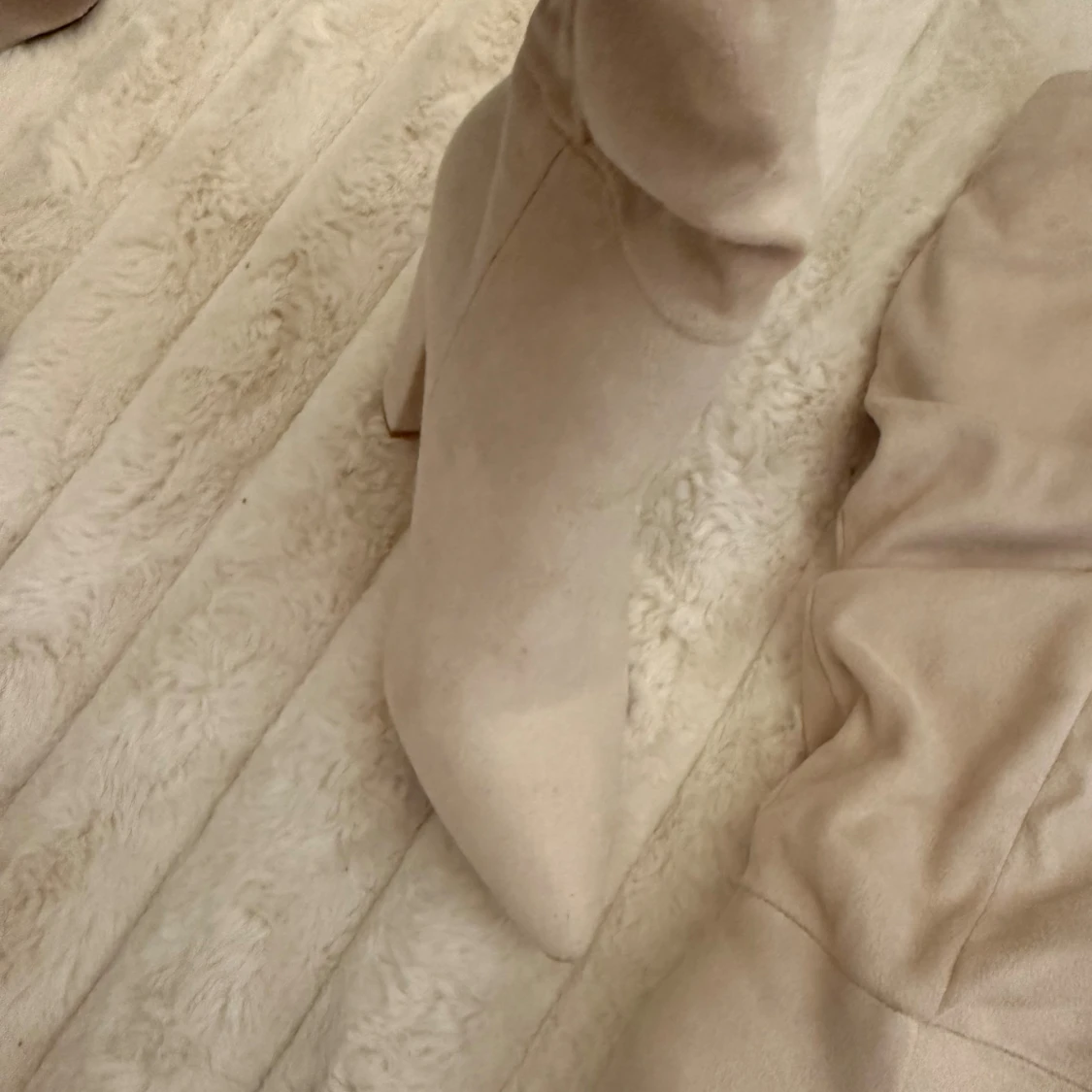 Säljer ett par snygga höga stövlar i beige mocka-look med spetsig tå och rejäl blockklack. Stövlarna har en slouchy passform och är perfekta för att lyfta vilken outfit som helst. Supersnygga till både jeans och kjol!