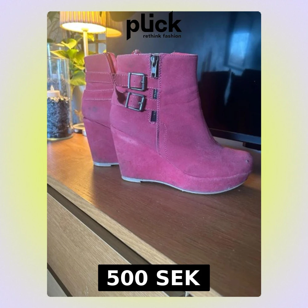 Snygga vinröda stövletter i mocka-look med kilklack, dragkedja på sidan. Använt flitigt så sulan är nötta,men annars bra skick. Storlek 38/39