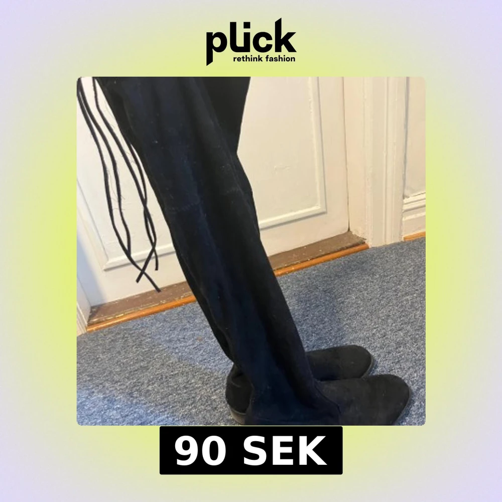 Säljer ett par svarta lårhöga stövlar i mjuk mocka med rund tå och låg platt sula. Stövlarna har snörning upptill för att sitta på plats och är perfekta för att lyfta vilken outfit som helst. Köpta från vinted men har personligen inte använt dem, lite smutsiga men kan enkelt lösa med en tvätt. Skriv om fler bilder behövs.