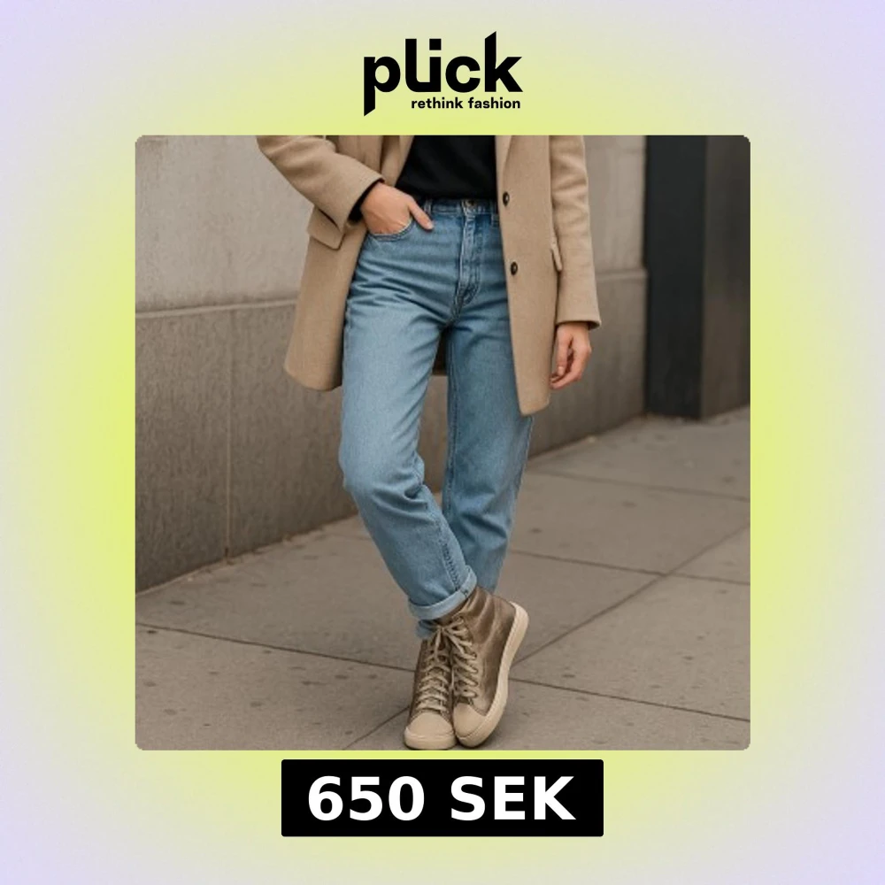 Snygga och bekväma high-top sneakers i metallicläder från L’Ecologica - Made in Italy. Tillverkade i Italien med mjukt läder och diskret glans. Passar perfekt till jeans, klänning eller mer avslappnade byxor. Skick: Varsamt använda, naturliga veck i lädret (se bild), sulor i fint skick Färg: Champagne/guld (ljus metallic) Material: Äkta läder ovandel och foder, gummisula Märke: L’Ecologica (präglad sula)