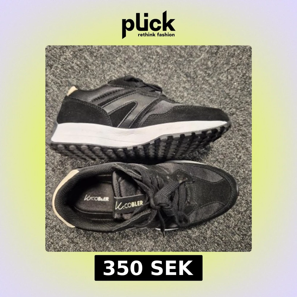Svarta sneakers från K.COBLER med vita detaljer på hälen och en tjock, vit sula. Comfort foamsula