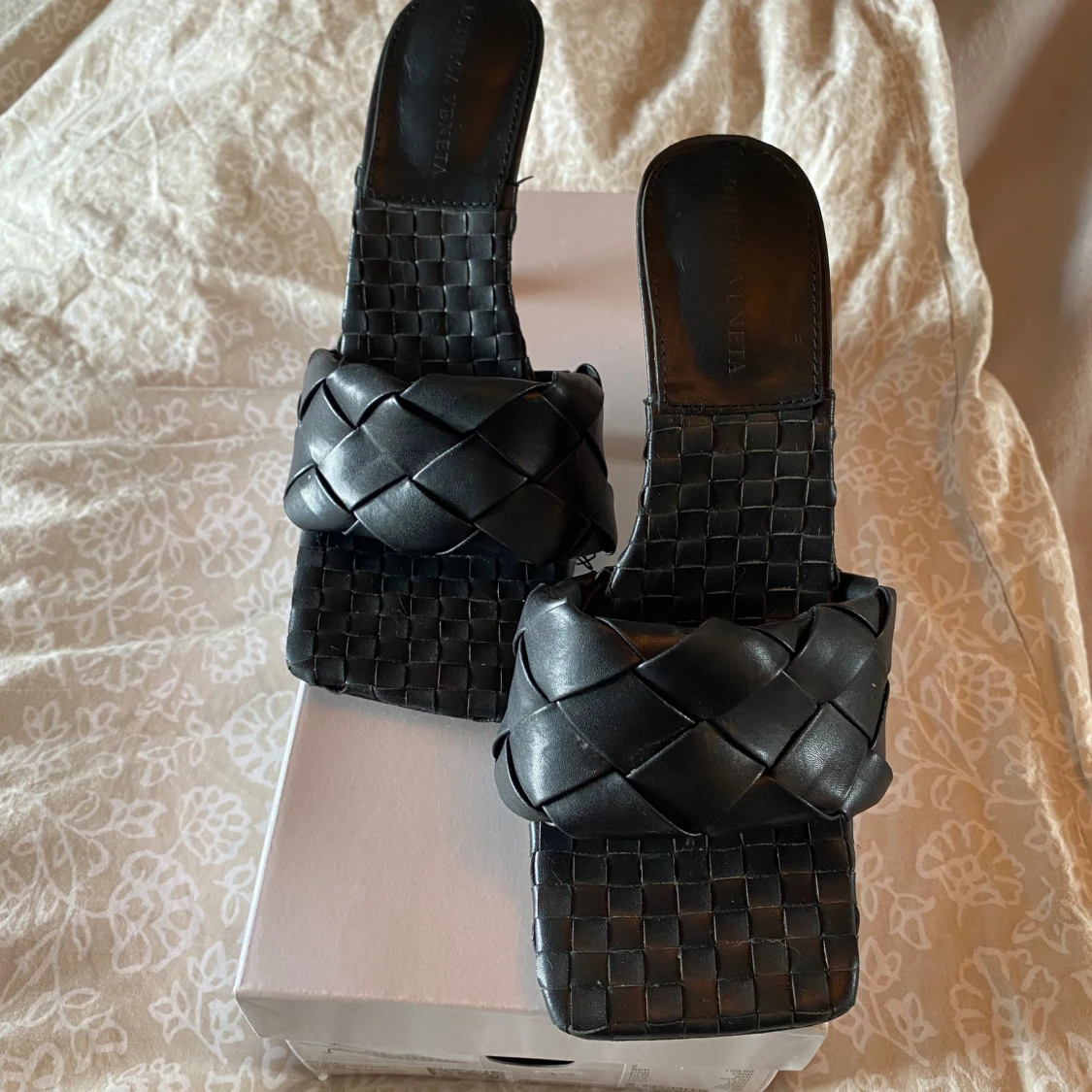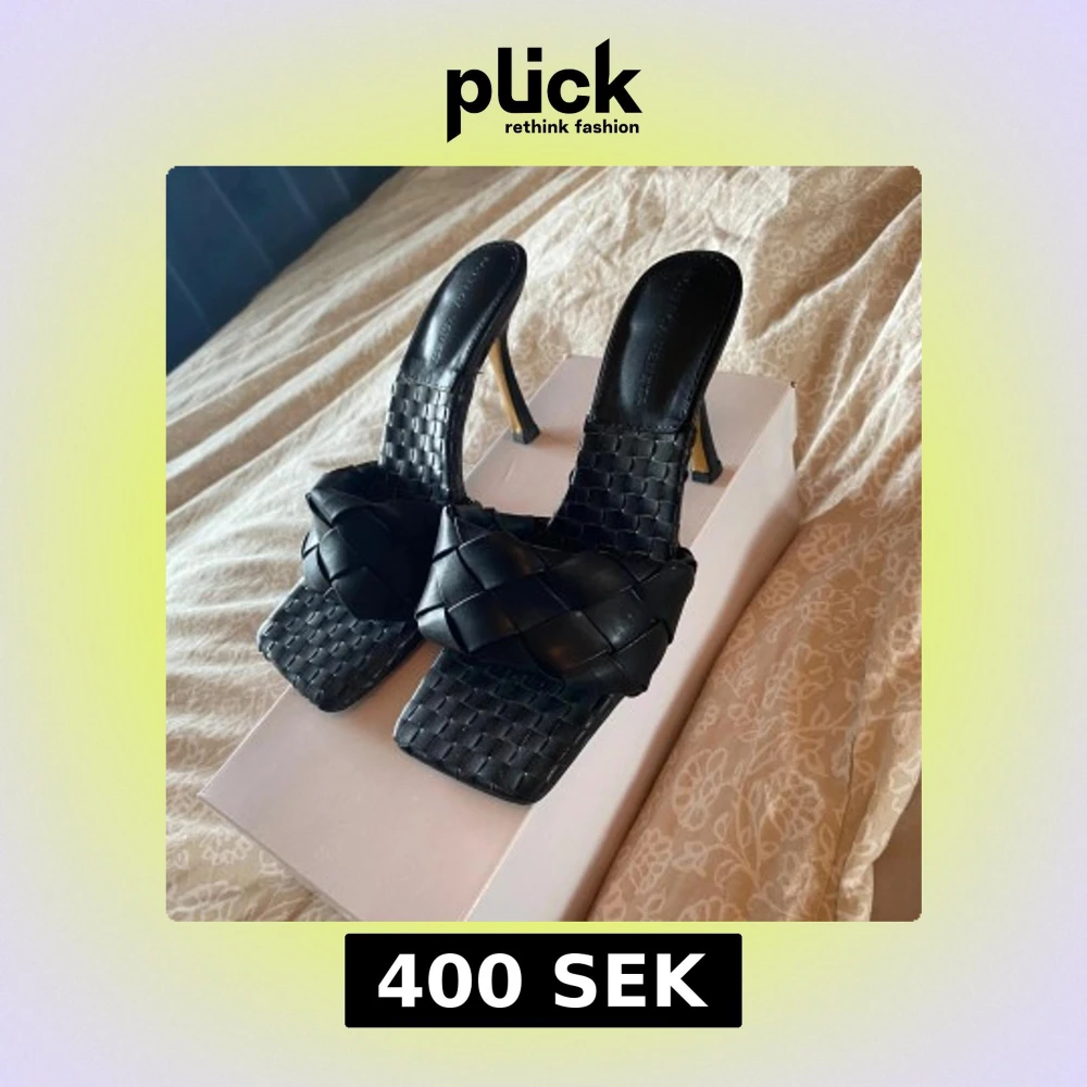 Snygga svarta höga sandaler med flätad design i skinn. Skorna har fyrkantig tå, hög klack och bred rem över foten. Perfekta för dig som vill ha en trendig och lyxig look med statement-känsla. Köptes för 1000 kr. Passar 38-39