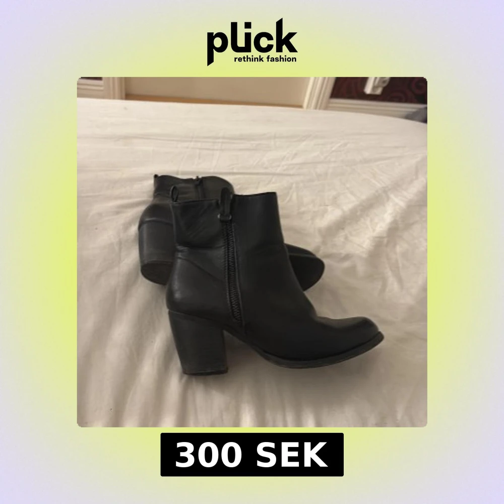 Säljer ett par svarta boots i skinn med chunky klack och dragkedja på sidan. Skorna har en rund tå och en stilren design som passar till många outfits. Perfekta för dig som gillar en klassisk look med lite edge.