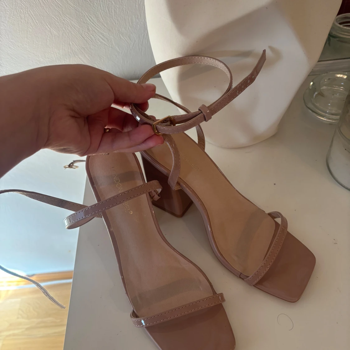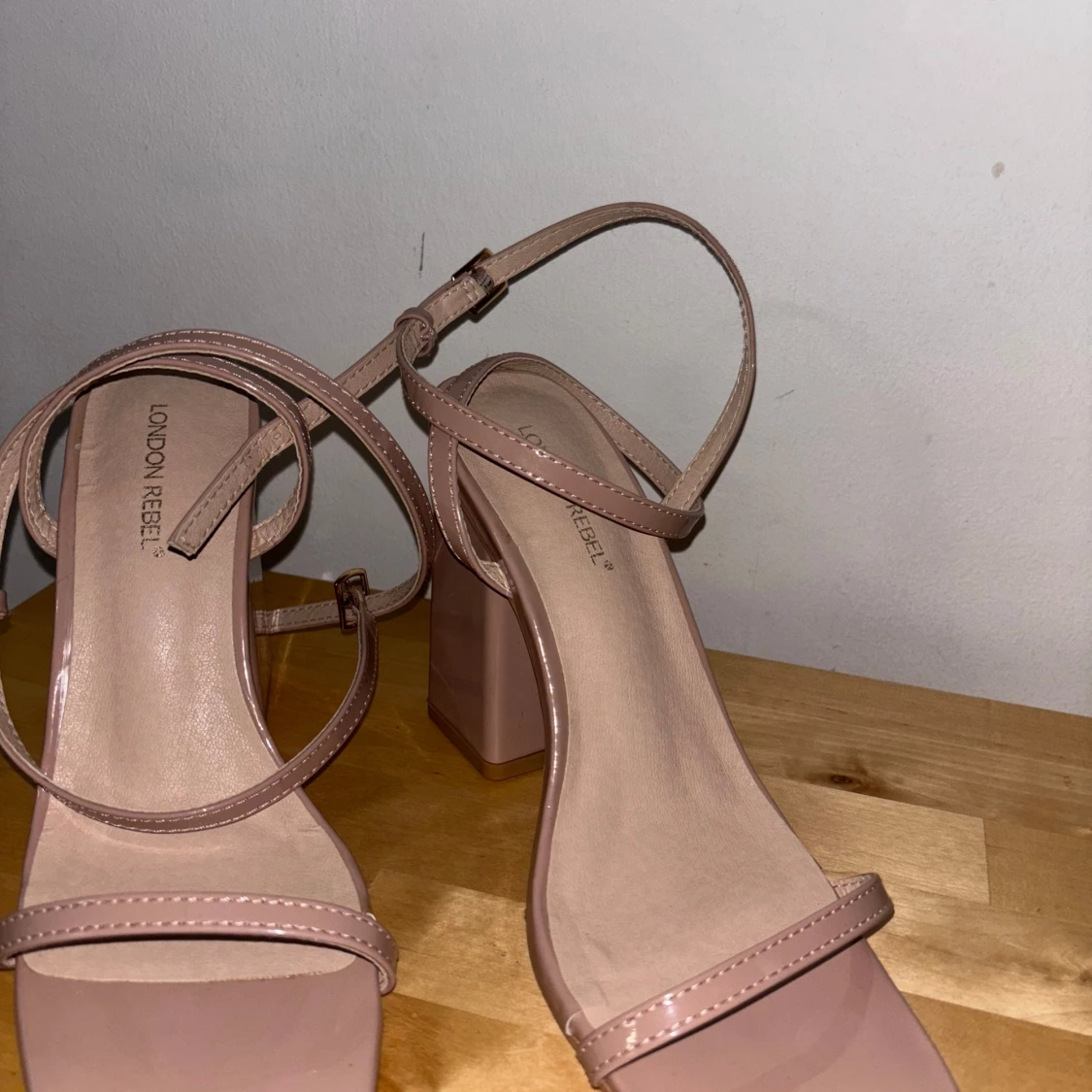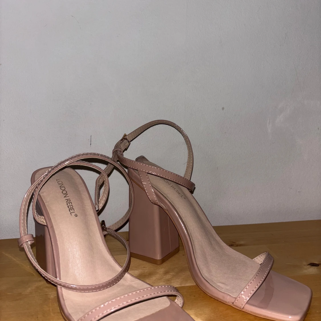 Snygga sandaler i beige från London Rebel med höga blockklackar och tunna remmar. Skorna har fyrkantig tå och justerbart spänne vid ankeln. Tillverkade i syntetmaterial med glansig finish, perfekta för att lyfta din outfit.