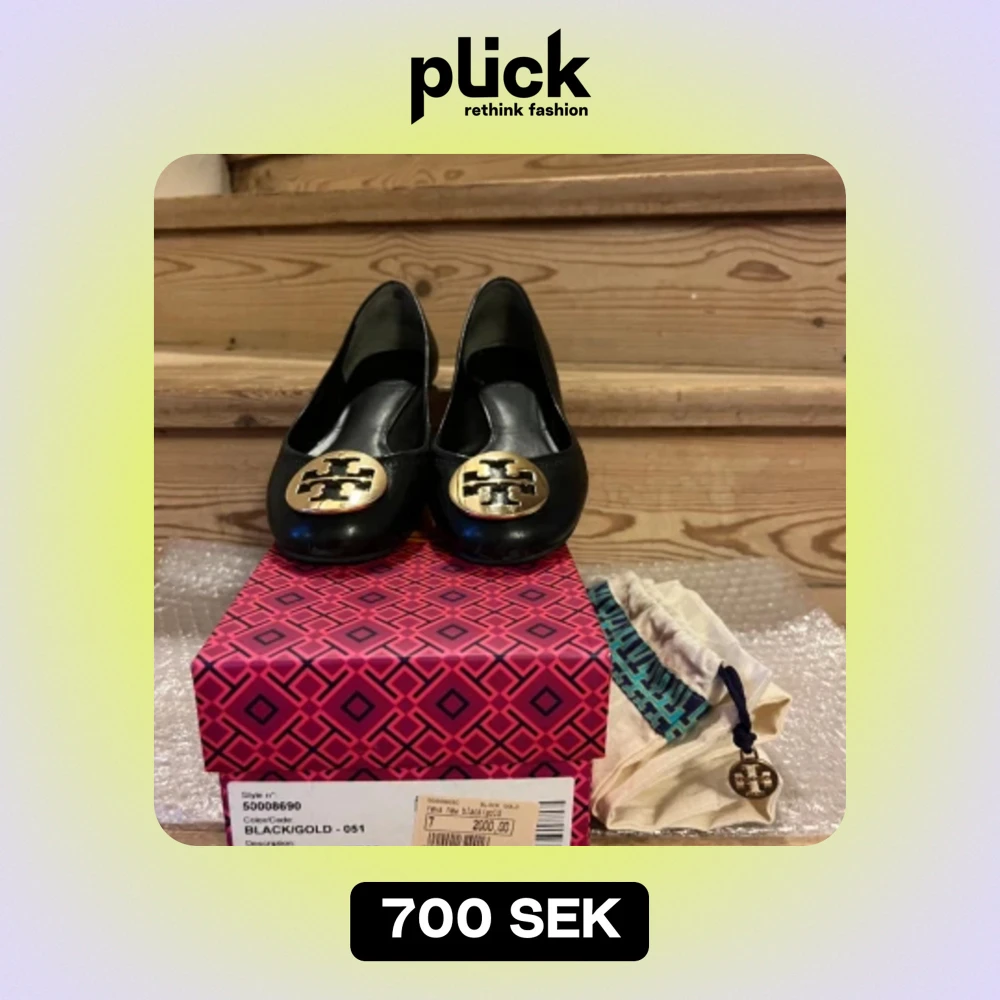Fin begagnad ballerina från Tory Burch, populärt modell. Modellen kallas det: REVA BALLET, style nummer är 50008690 i Svart/Guld. Sälja med dustbag och i original skolådan. Gärna skicka ett mejl om önskar mer flera bilder av skorna.