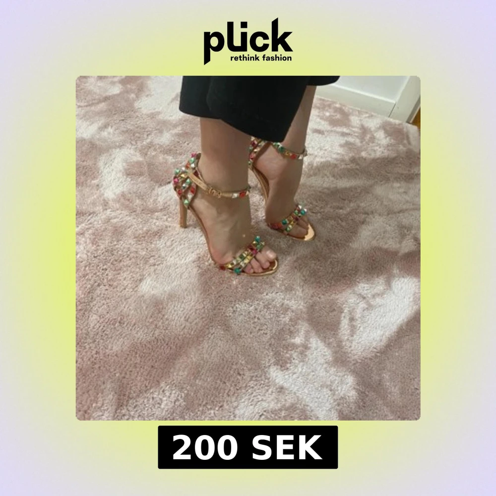 Snygga klackskor i guld med färgglada nitar i rött, grönt och blått. Skorna har en öppen tå och justerbar rem runt ankeln. Perfekta för att ge en färgklick till din outfit.