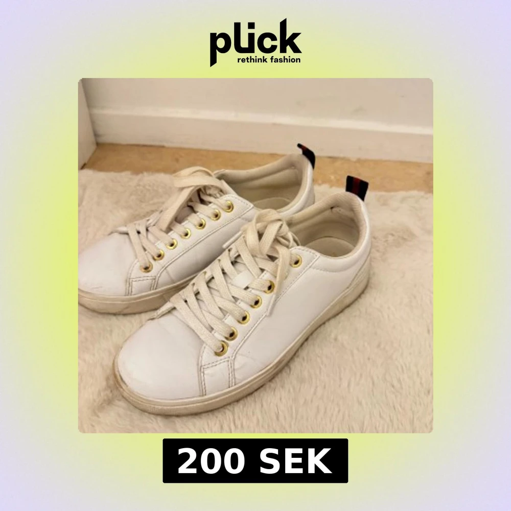 Snygga vita sneakers i skinn med guldfärgade öljetter och vita snören. Baktill finns en svart och röd randig detalj med guldfärgad knapp. Klassisk rund tå och platt sula, perfekt för en clean och stilren look.
