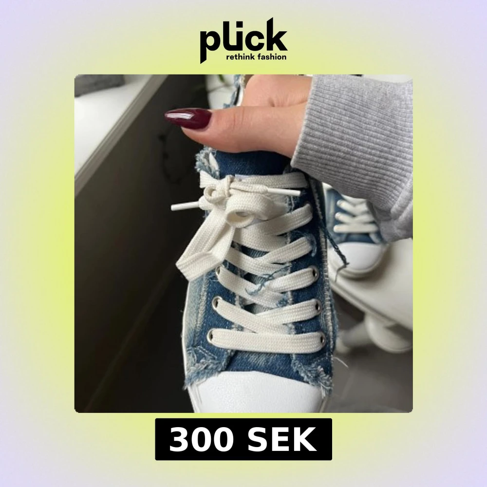 Säljer ett par coola sneakers i blå denim med fransiga kanter och vita snören. Skorna har vit gummitå och platt sula