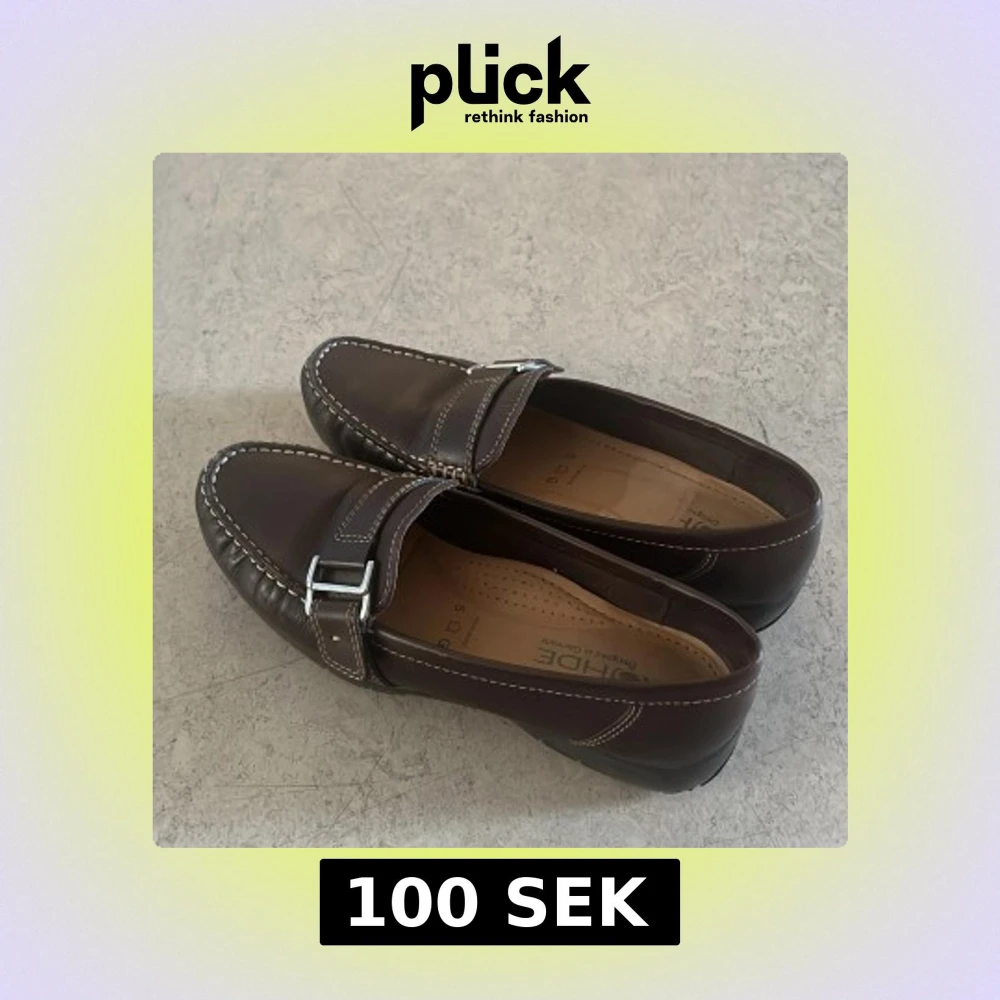 Snygga bruna loafers i skinn med dekorativt metallspänne och kontrastsömmar. Klassisk design med rund tå och platt sula, perfekta för en stilren look. Bekväma och tidlösa skor som passar till många outfits.