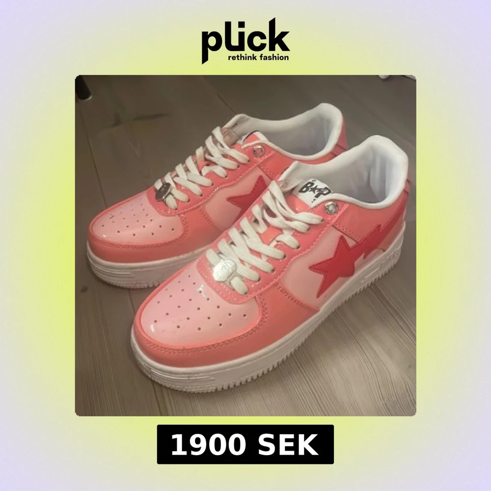Säljer ett par BAPE STA sneakers i blankt rosa och rött med vit sula och vita skosnören. Skorna har den ikoniska stjärnan på sidan och BAPE-logga på plösen. Perfekta för dig som vill sticka ut med färg och streetstyle.