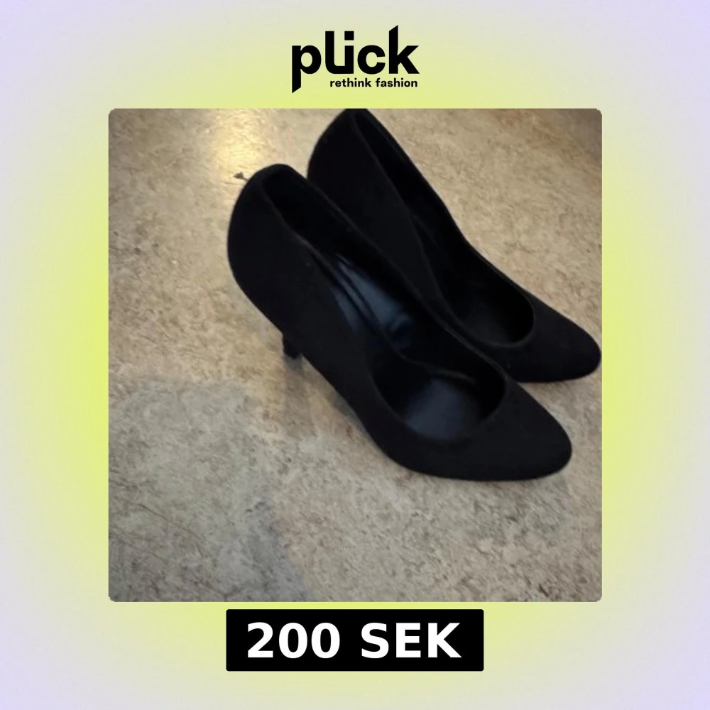 Säljer ett par klassiska svarta pumps med rund tå och hög klack. Skorna har en stilren design och är tillverkade i ett material som liknar mocka. Perfekta för dig som vill ha en tidlös och elegant sko, perfekt för balen.