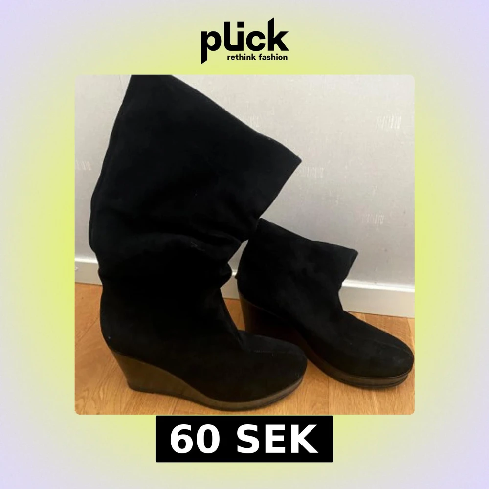 Säljer ett par svarta boots med kilklack i mocka. Skorna har en hög, slouchy skaft och plattformsula som ger extra höjd. Bekväma att gå i även under kalla vintrar och regnigt väder under hösten, 6cm i kilklacken. Använt sparsamt och tagit hand om väl! Storleken är 38 men passar även 37!