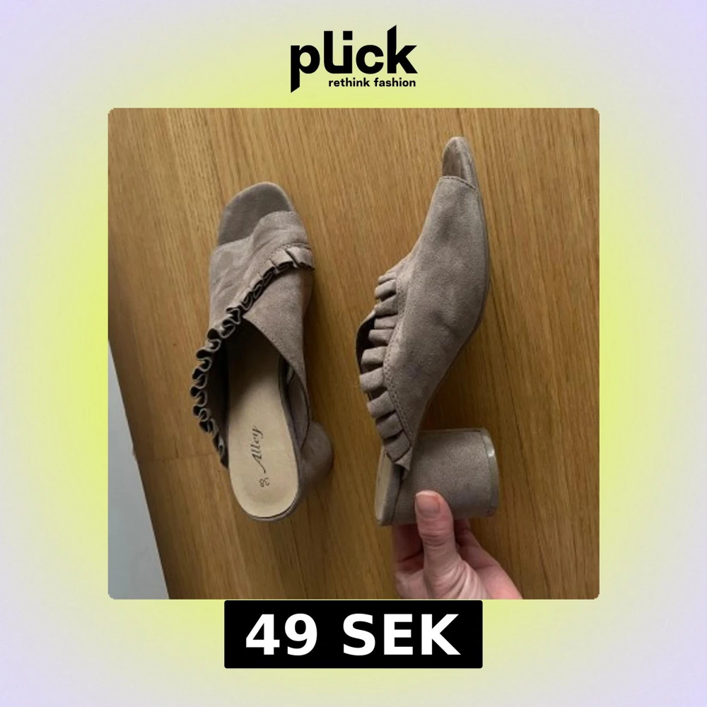 Säljer ett par beige sandaler från Alley med bred klack och öppen tå. Skorna har en snygg volangdetalj längs ovansidan och är superbekväma tack vare den stabila klacken. Storlek 38
