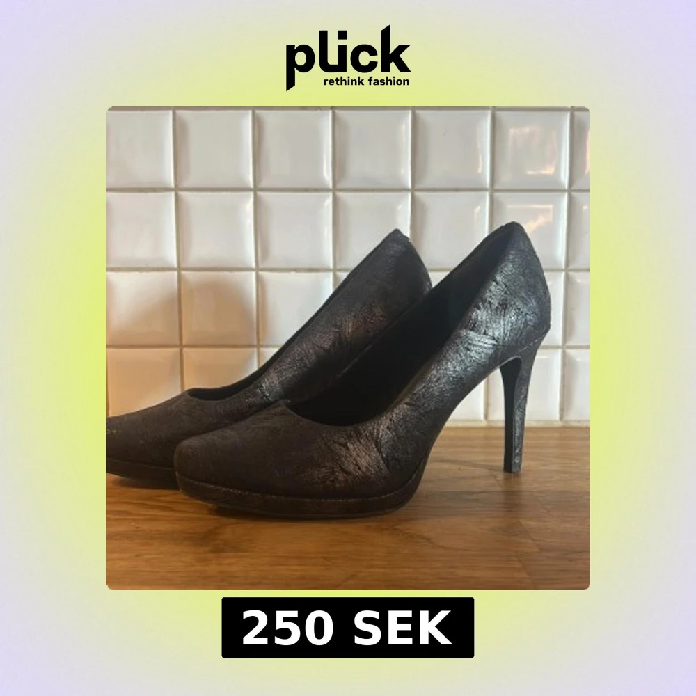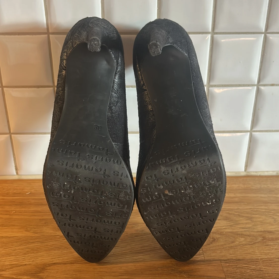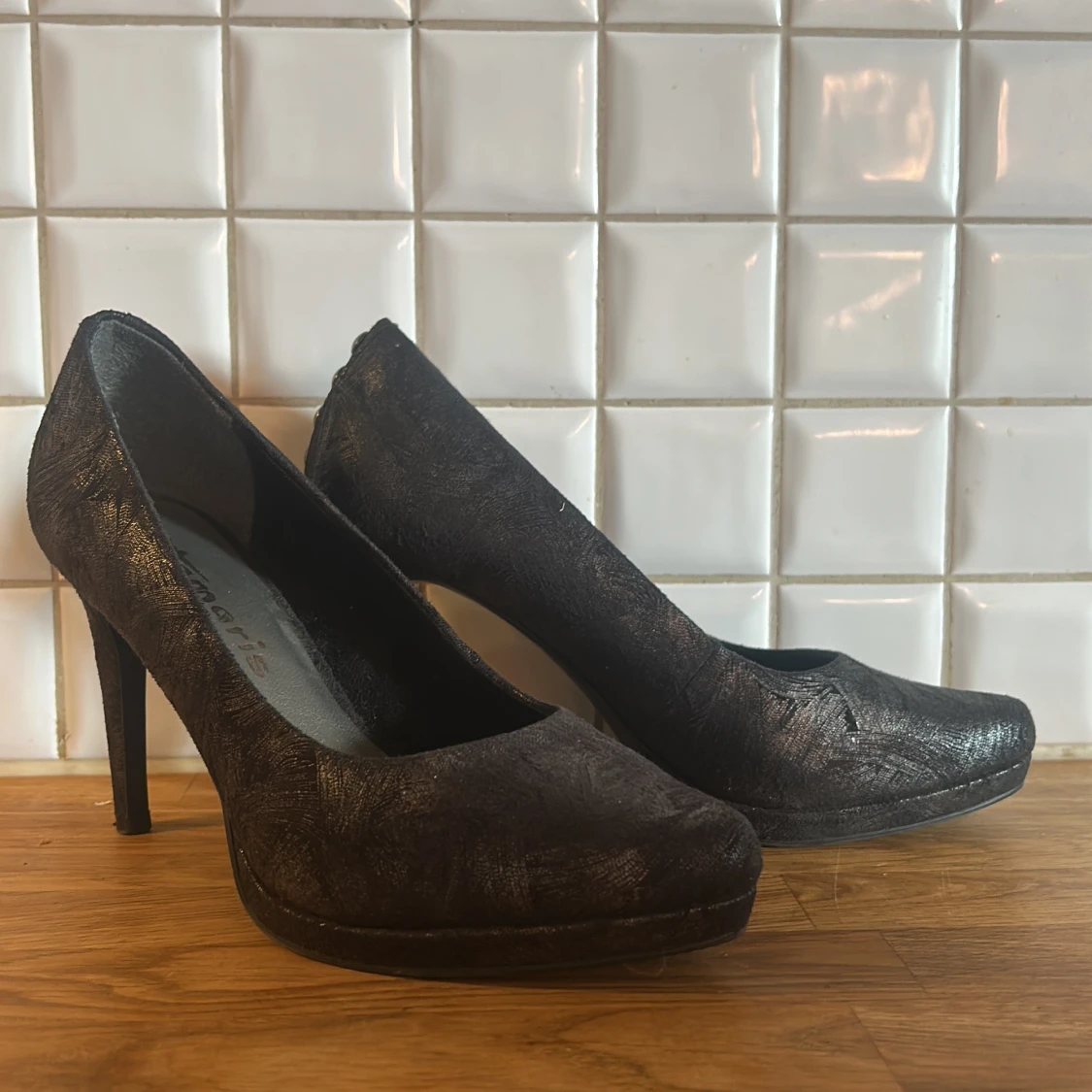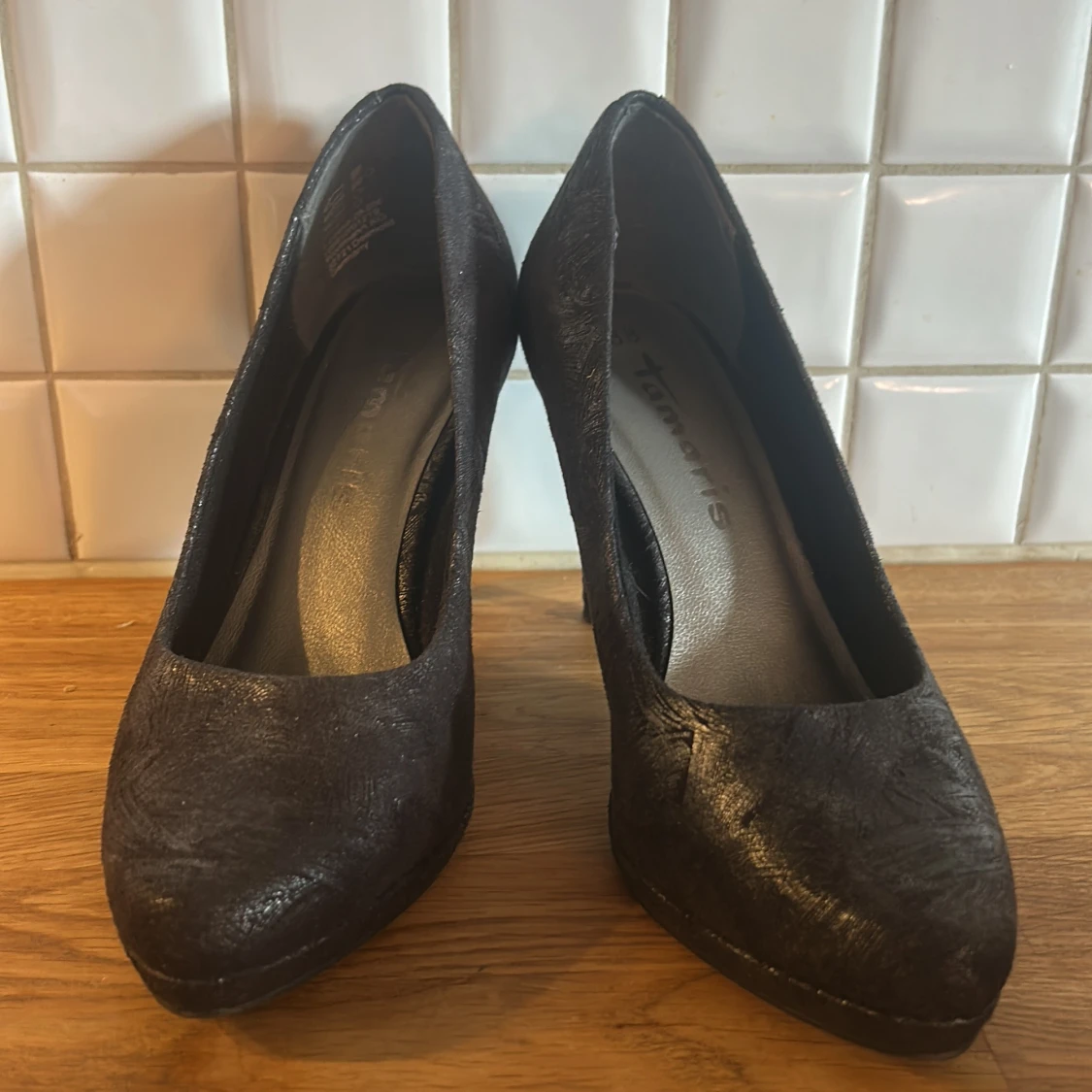 Snygga svarta högklackade skor från Tamaris med rund tå. Skorna har en cool textur i materialet och fyra silvriga nitar bak på hälen som ger extra edge. Perfekta för dig som vill sticka ut lite extra. Klassiskt snitt och plattform framtill för bekvämare känsla.