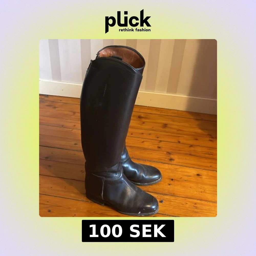 Säljer ett par klassiska svarta ridstövlar med rund tå och platt sula. Stövlarna är tillverkade i slätt skinn med en stilren och hög siluett som går upp till knäet. Insidan är fodrad i ljusbrunt läder för extra komfort. Perfekta för dig som gillar ridning.