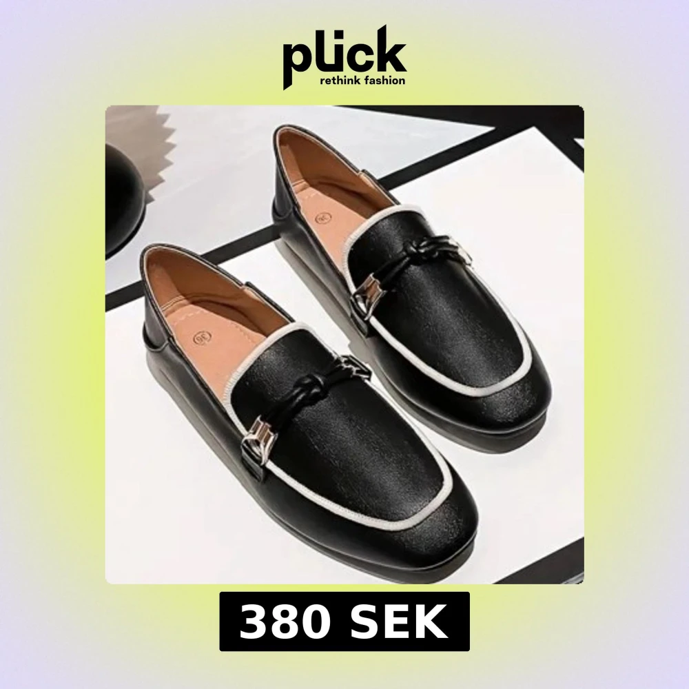 Snygga svarta loafers med vit kant runt öppningen och dekorativt spänne framtill. Skorna har en klassisk design med rund tå och platt sula, perfekta för en stilren look.