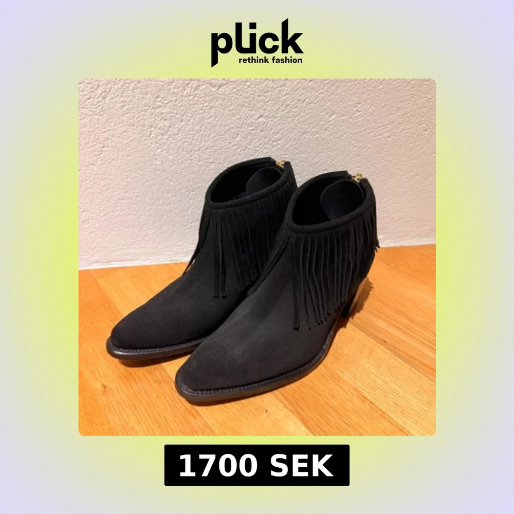 Snygga svarta stövletter från Primeboots i mocka med fransdetaljer runt skaftet och guldfärgade dragkedjor bak. Skorna har spetsig tå och låg klack, vilket ger en cool och trendig look. Perfekta för dig som gillar boots med lite edge. Nyskick då de är använda endast två gånger och storlek 38