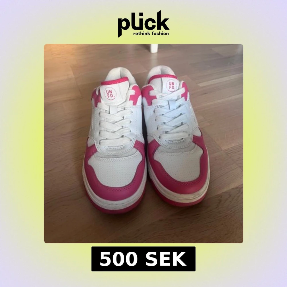 Säljer ett par fräscha sneakers från UNFD i vitt och rosa. Skorna har klassisk låg modell med snörning och rund tå. Perfekta för dig som vill sticka ut med färg på fötterna! De har endast använts 2 gånger då de var för stora för mig.