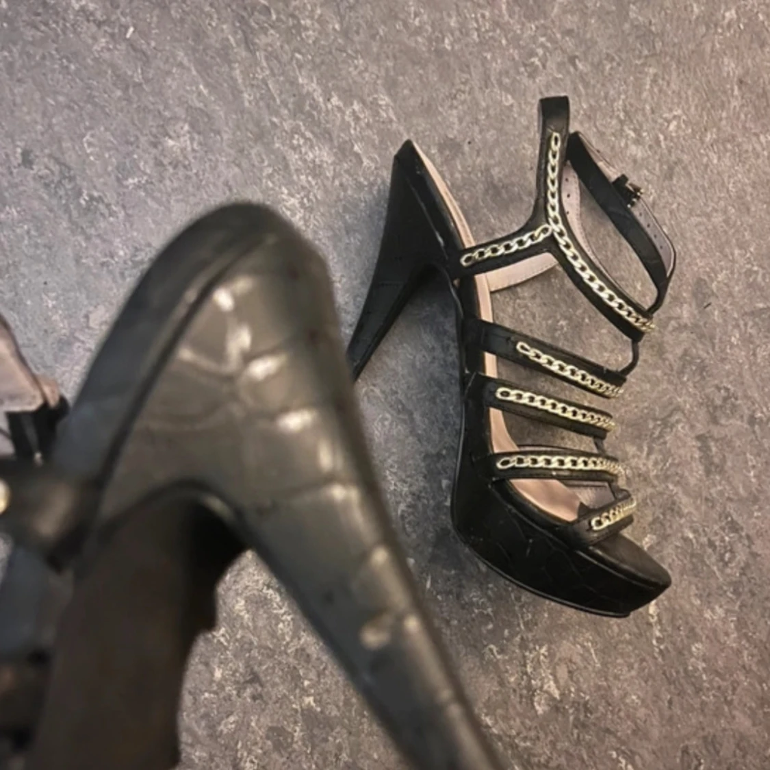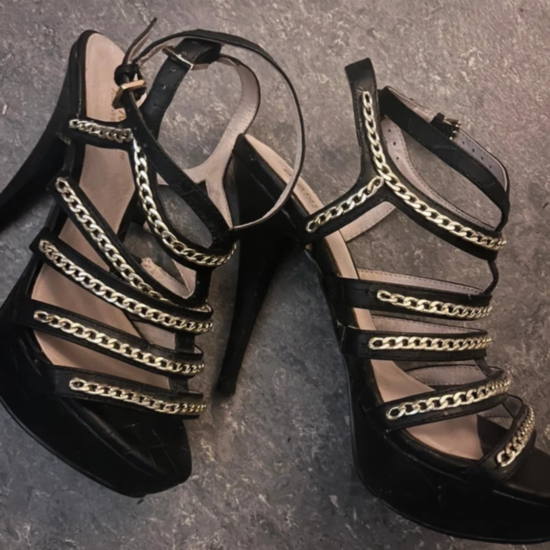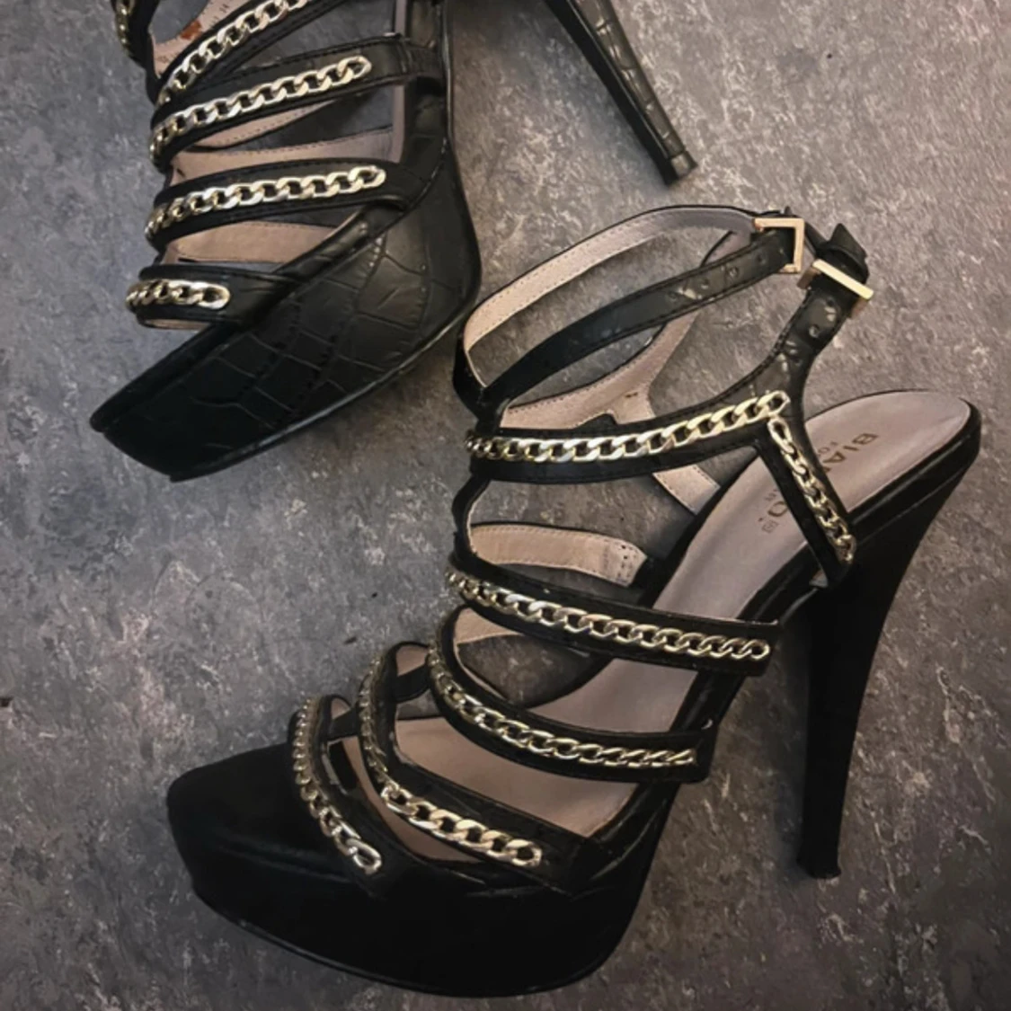 Eleganta svarta sandaler med hög klack och kedjedetaljer. Skorna har flera remmar med guldfärgade kedjor och en justerbar rem runt ankeln. Perfekta för en stilfull look.