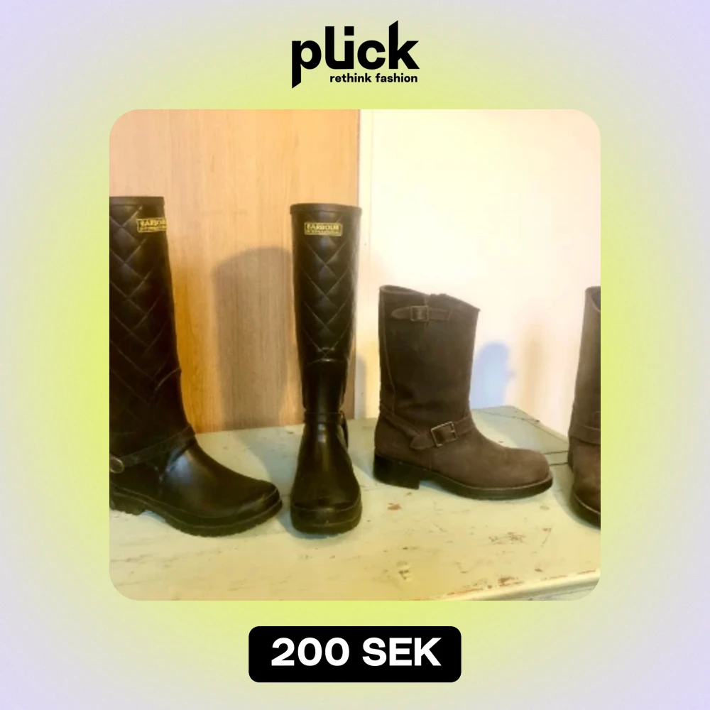 Bild 1: Barbour gummistövlar, Stl 38, använda 2 ggr: 600 kr Johnny Bulls Western Boots, Stl 39, bra skick: 300 kr Bild 2:Mockastövlar Lacoste, Stl 37, bra skick: 200 kr. Skechers, Stl 39, använda ett par ggr: 300kr Bild 3: Ted B, 10cm klack 500kr