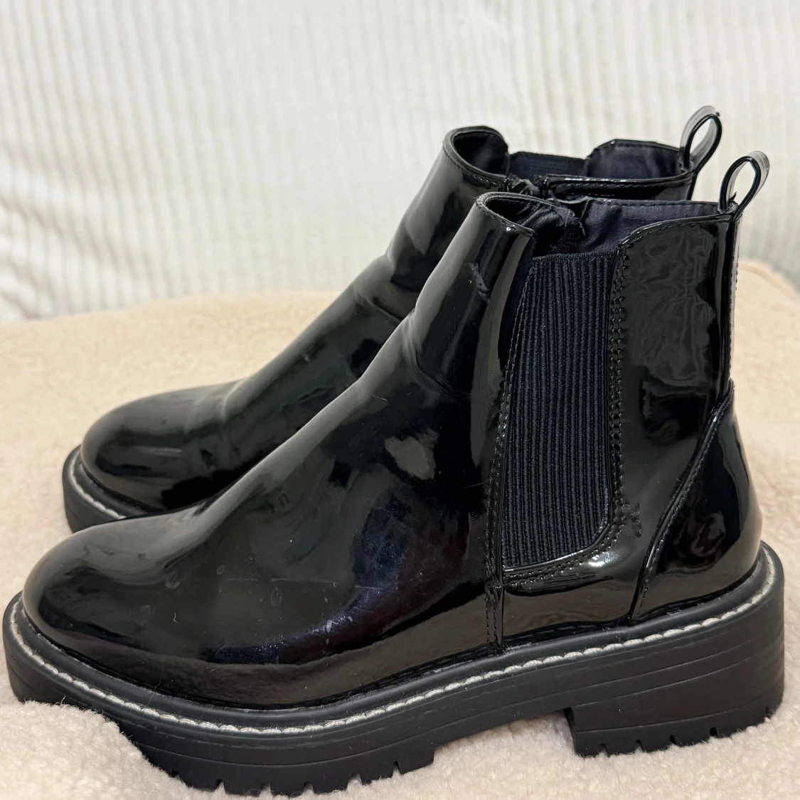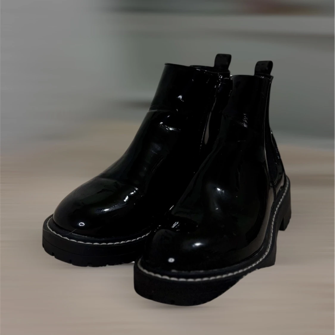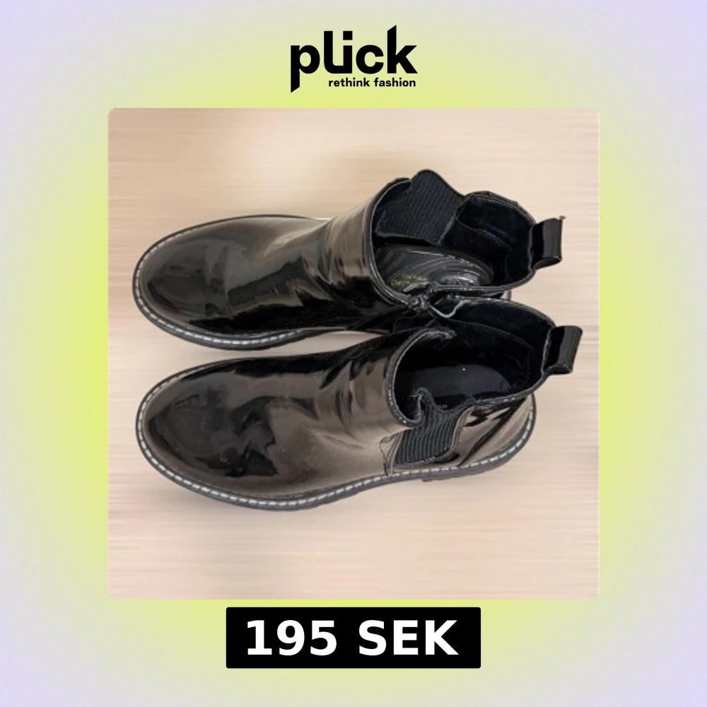 Säljer ett par svarta Ankel boots i glansigt lackmaterial med bred resår på sidorna och kraftig platt sula. Skorna har rund tå och dragflikar bak för enkel påtagning. Perfekta för dig som vill ha en edgy och stilren look.