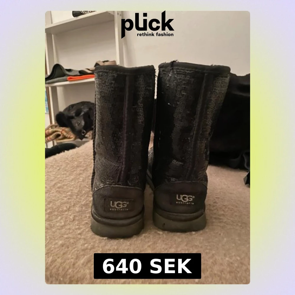 Säljer ett par svarta UGG boots med glittriga paljetter över hela skon. De har en rund tå och platt sula, samt UGG-logga bak på hälen. Insidan är mjuk och varm, perfekt för kalla dagar. Snygga att styla till jeans eller leggings.