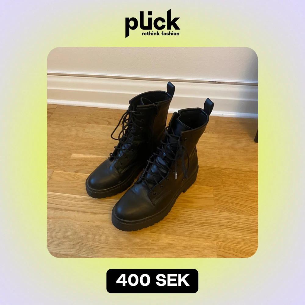 Säljer ett par snygga svarta boots i skinn med snörning framtill. De har en robust sula och är perfekta för höst och vinter. Bootsens stilrena design gör dem lätta att matcha med olika outfits. De är i mycket bra skick och redo för nya äventyr!