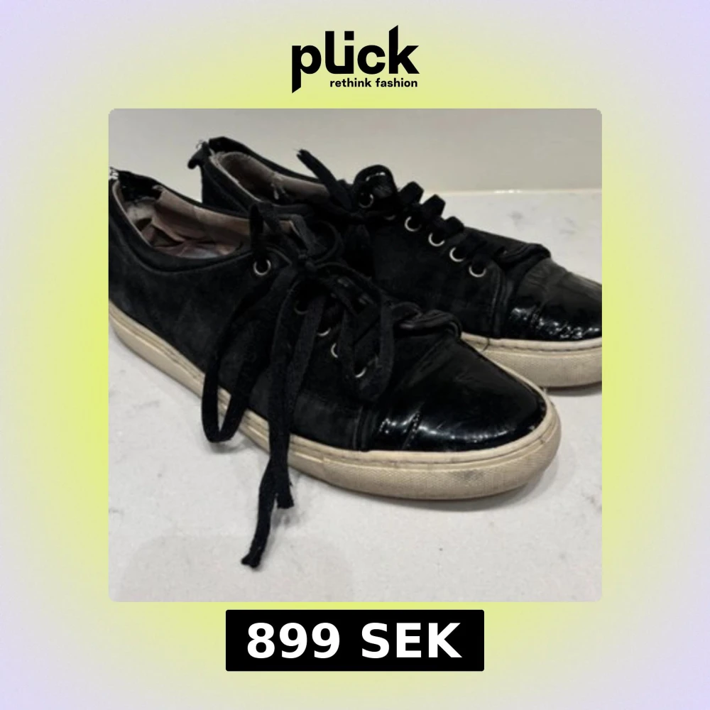 Svarta sneakers med snygg lackad tå och klassisk vit sula. Skorna har snörning och en mix av material med både mockaliknande och glansiga detaljer. Perfekta för dig som gillar en stilren men ändå lite edgy look. Det är inte lika slitet i verkligheten!