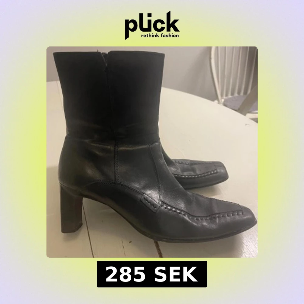 Snygga svarta stövletter i skinn med markerad söm och spetsig tå. Skorna har en medelhög klack och dragkedja på insidan för enkel på- och avtagning. Perfekt för dig som gillar stilrena boots med lite edge.