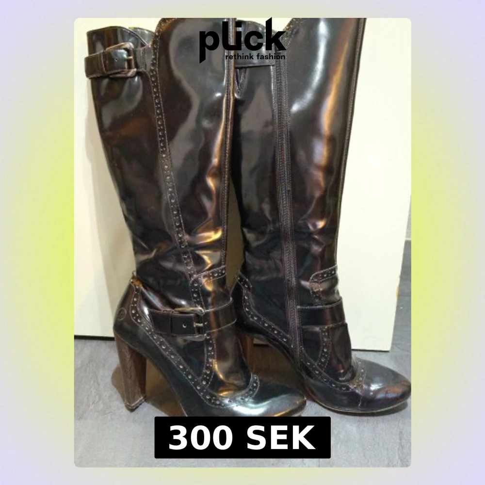 Snygga svarta boots i glansigt skinn med hög klack och dekorativa spännen upptill och vid ankeln. Dragkedja på insidan och detaljerade sömmar med små nitar längs kanterna. Perfekta för dig som vill ha ett statement-plagg till hösten eller vintern.