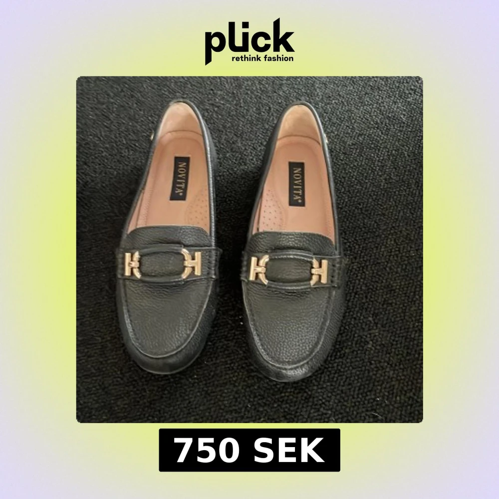 Stilrena svarta loafers från Novita med guldfärgad metallspänne framtill. Skorna har rund tå och är tillverkade i skinn med en klassisk design. Perfekta för en snygg och tidlös look. Strl 39 använda en gång pga storlek.