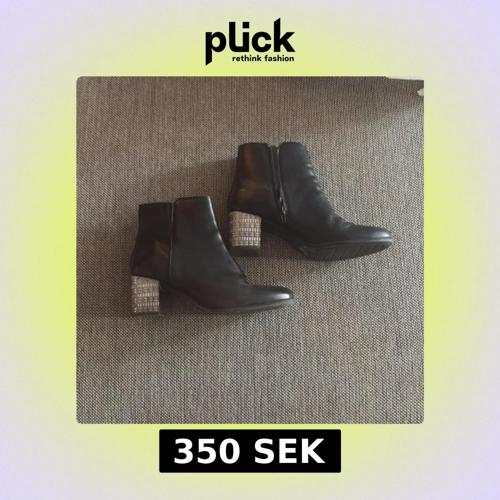 Säljer ett par svarta boots med rund tå och en unik silvrig klack med mönstrad struktur. Skorna har dragkedja på sidan och är i ett stilrent utförande som passar till många outfits.