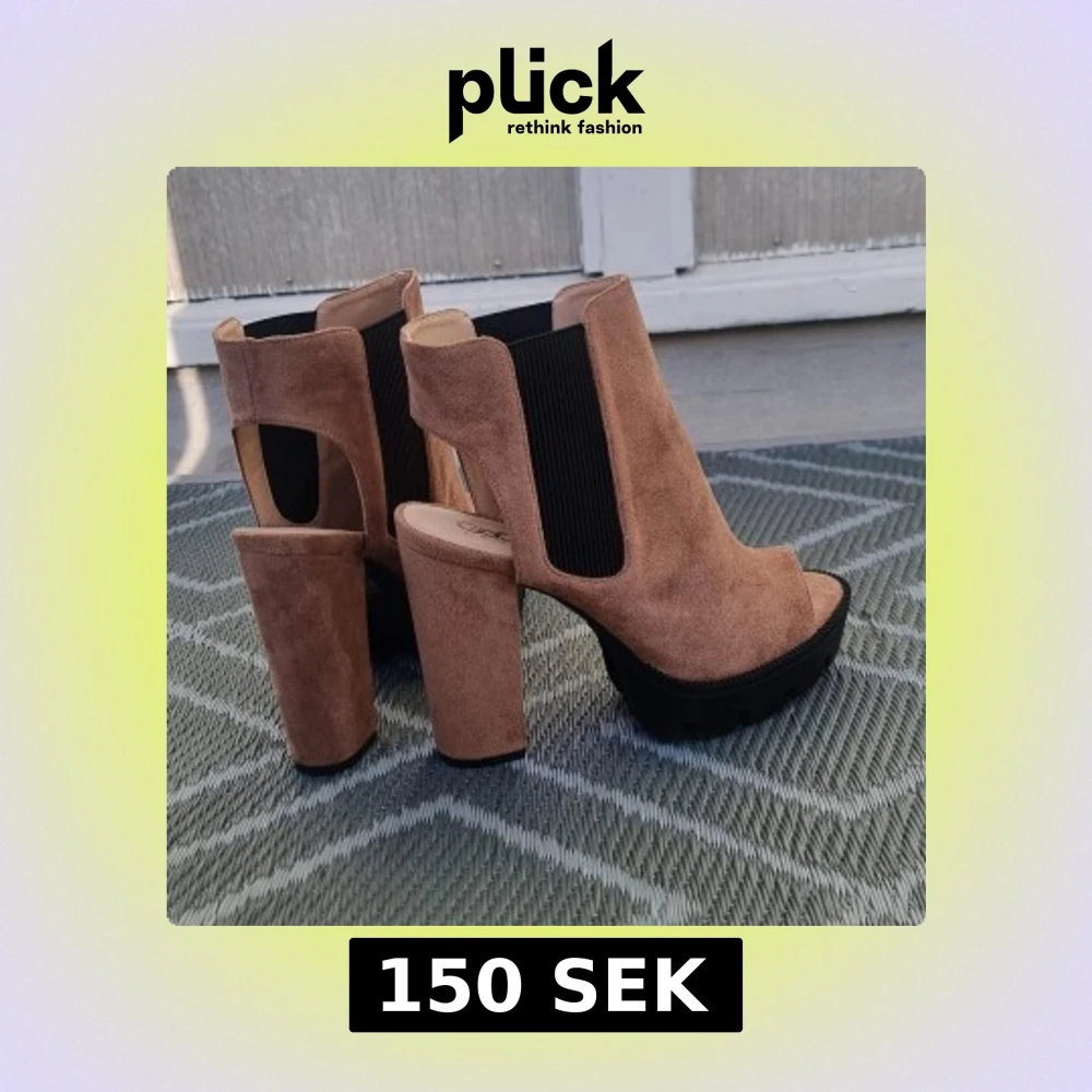 Chunky stövletter i brun mocka med hög klack och platåsula. Skorna har öppen tå, bred resår i svart på sidorna och coola utskurna detaljer vid hälen. Perfekta för dig som vill sticka ut med en edgy vibe.