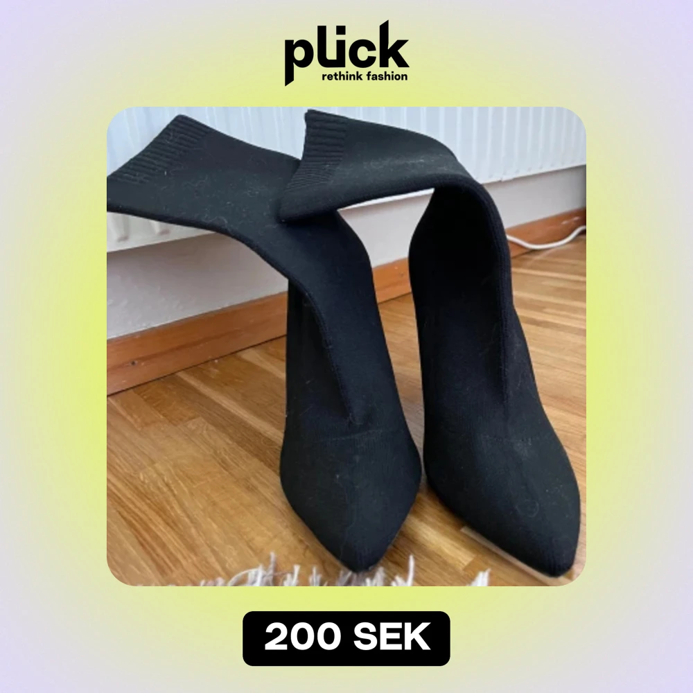 Säljer ett par eleganta svarta stövletter med spetsig tå och klack. De är i ett stickat material som ger en tight passform och en stilren look. Perfekta för höst och vinter, och funkar lika bra till fest som till vardags. klacken är 11cm , använd 1-2 gånger. spetsig tå gör att dom känns mindre därför kan kännas som en stolek mindre (40 är storleken) 🖤
