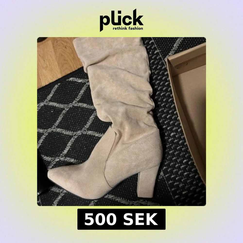 Snygga beige stövletter med mjukt, rynkat skaft och spetsig tå. Skorna har en stadig klack och är tillverkade i mocka för en lyxig känsla. Perfekta för dig som vill ha en trendig och stilren look. Storleken är 39-42 Dem är helt nya Aldrig använt.Finns även samma men i färgen svart! Pris går att diskuteras!