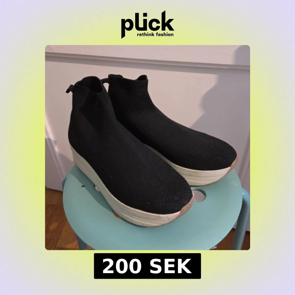 Svarta sneakers med stickad ovandel och vit platåsula. Skorna har en strumpliknande passform och rund tå, samt en praktisk ögla bak för enkel påtagning. Snygg och modern design som passar till många outfits.