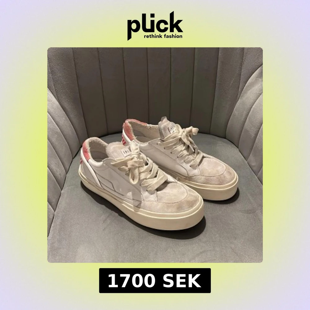 Säljer ett par vita sneakers från Inuiiki med bred sula och rosa textdetalj på hälen. Skorna har snörning. DEM SKA SE SLITNA UT. Jag har inte använt dem mycket alls men min hund har bitit lite på dem.