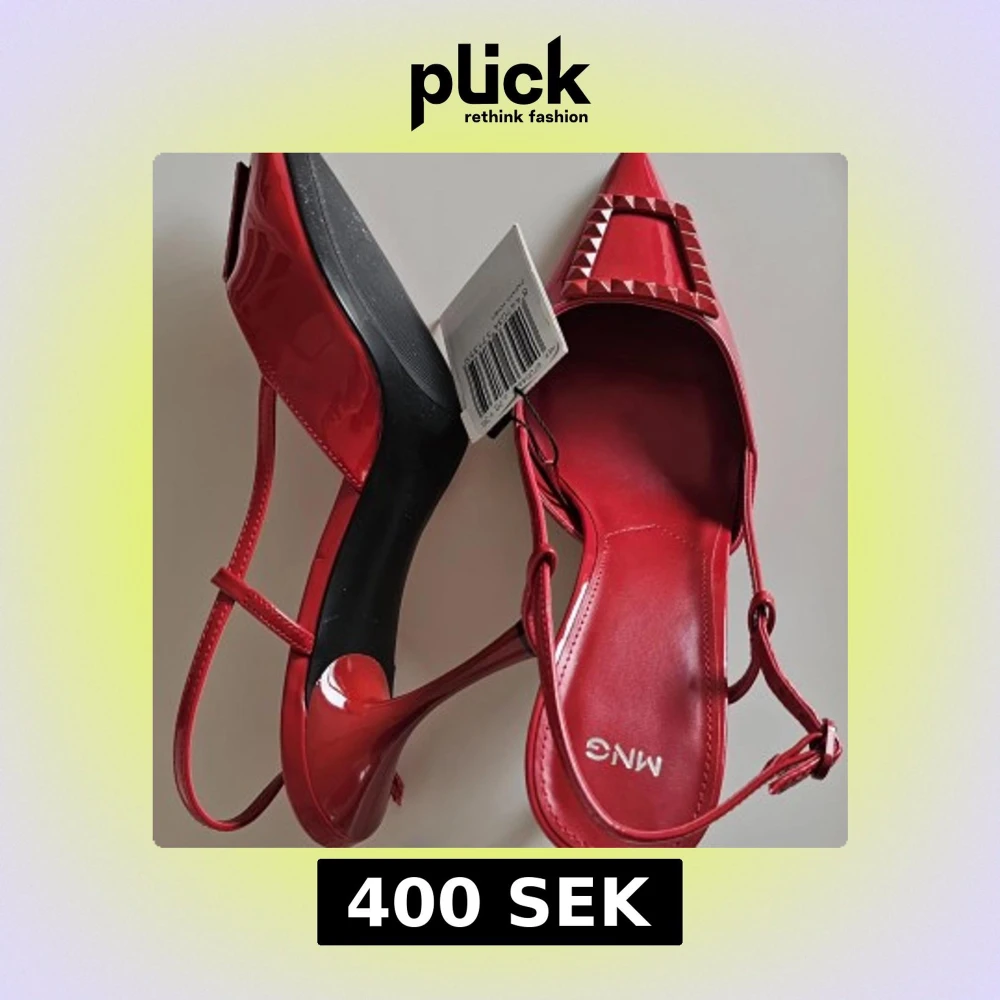 Helt nya, Snygga röda pumps från MNG med lackad finish, spetsig tå och dekorativt spänne med nitar framtill. Skorna har smala remmar och hög klack som ger en elegant siluett. Priset kan sänkas vid snabbaffär. Storlek 39 på de och köptes nypris för 599kr.