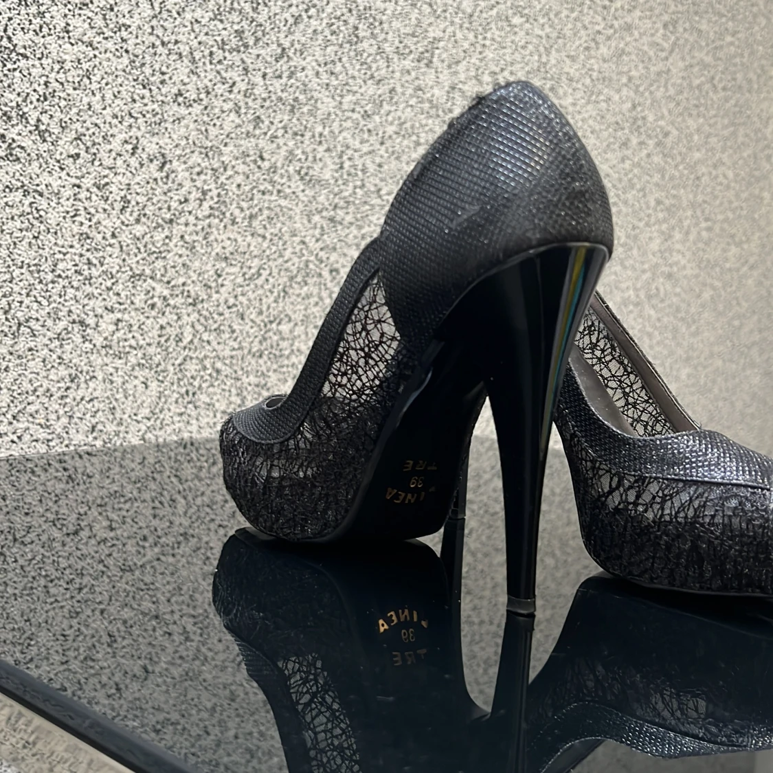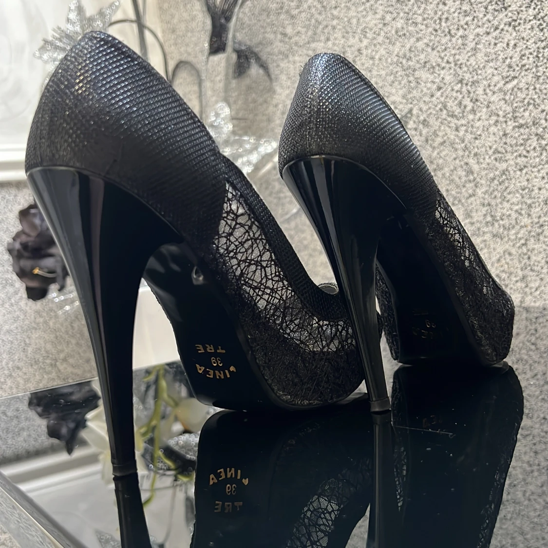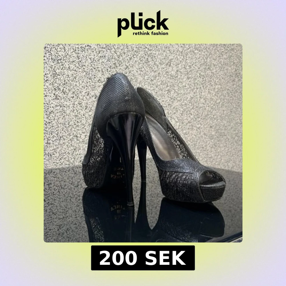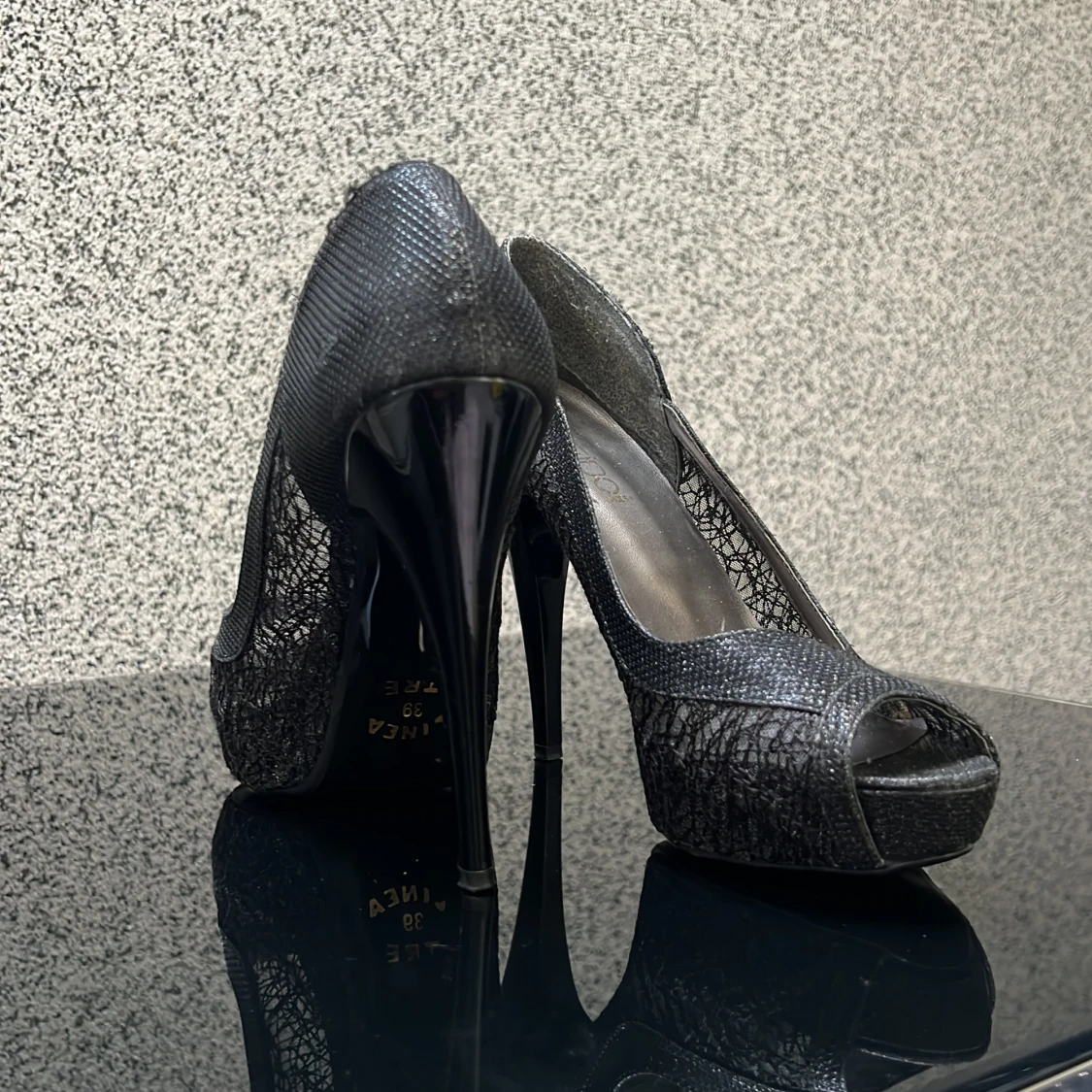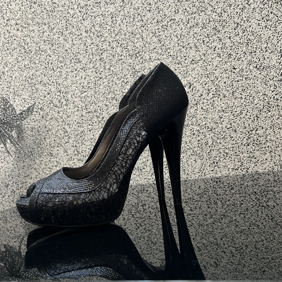 Eleganta svarta pumps med hög klack och spetsdetaljer. Skorna har en öppen tå och en glansig finish som ger en lyxig känsla.