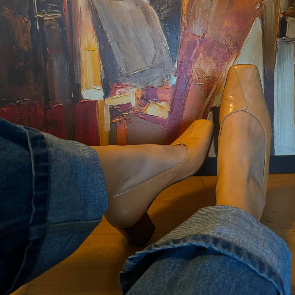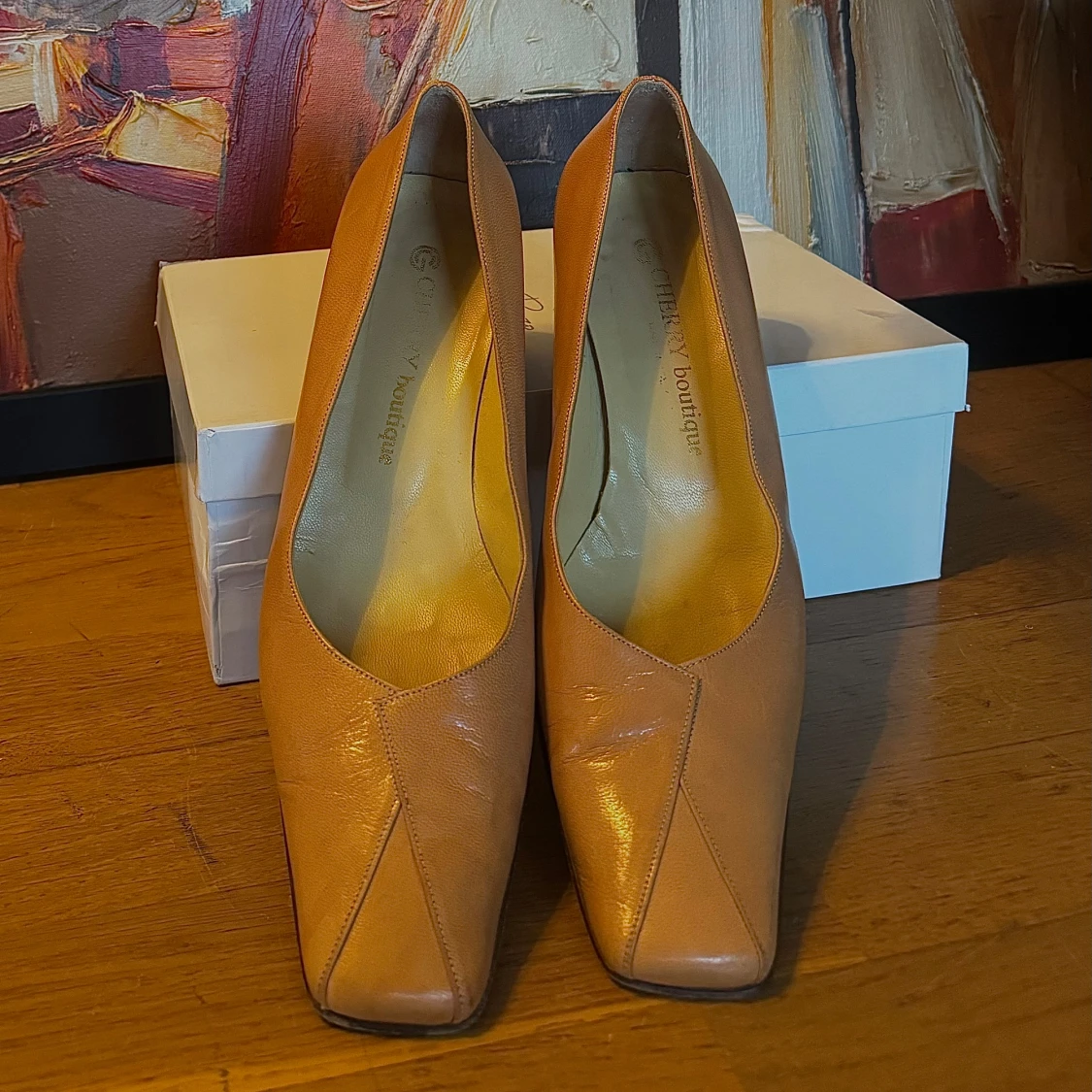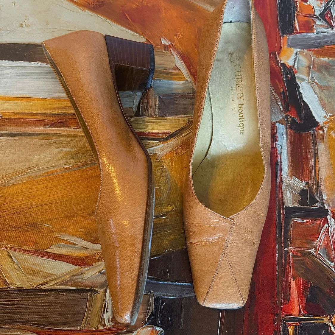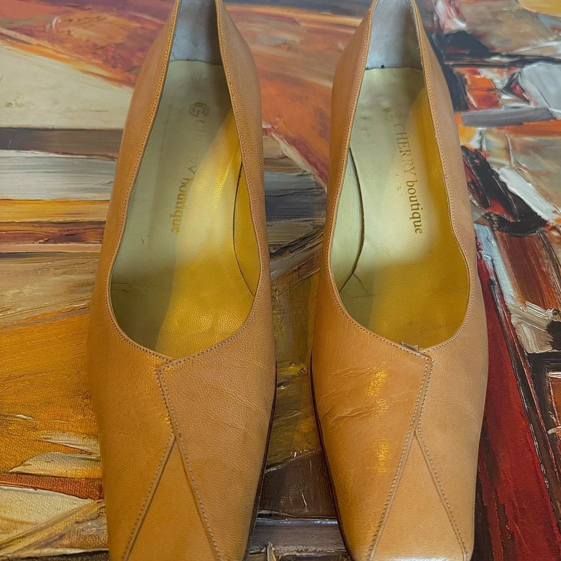 Säljer ett par eleganta beige pumps i skinn med en bekväm blockklack. De har en spetsig tå och är perfekta för både vardag och fest. Skorna är i bra skick och redo för nya äventyr!