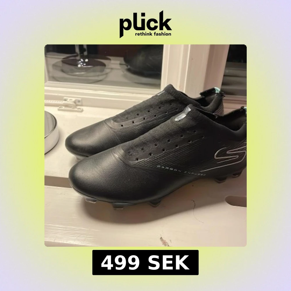 Säljer ett par svarta fotbollsskor från RAZOR, sketchers i storlek 39. Skorna har en clean, modern design med diskreta silverdetaljer och texten 'Carbon Infused' på sidan. Ovandelen är i syntet/textil och sulan har en cool, iriserande finish. Perfekta för dig som vill sticka ut på planen.