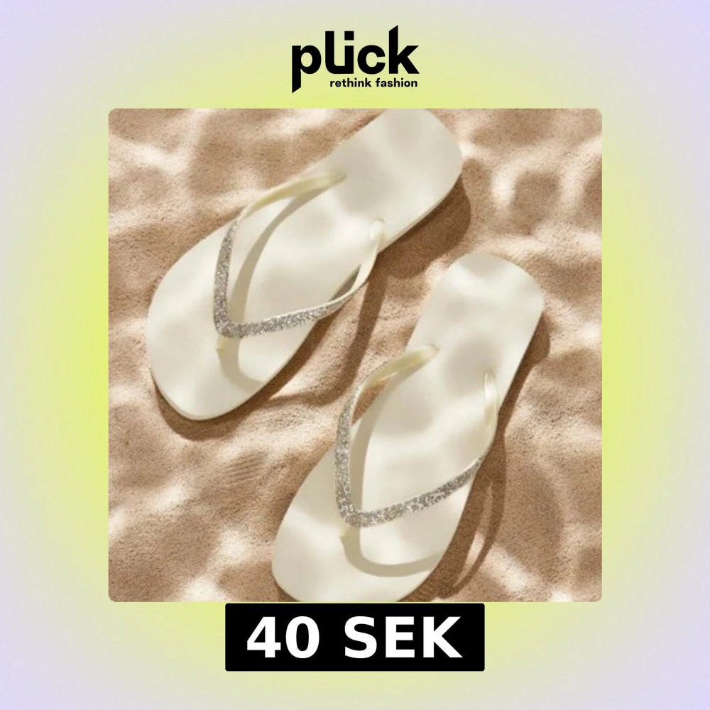 Snygga beige sandaler med glittriga remmar i silver. Perfekta för stranden eller varma dagar. Platt sula och klassisk flipflop-modell i syntetmaterial. Lätta att matcha med somriga outfits och ger en fräsch vibe.