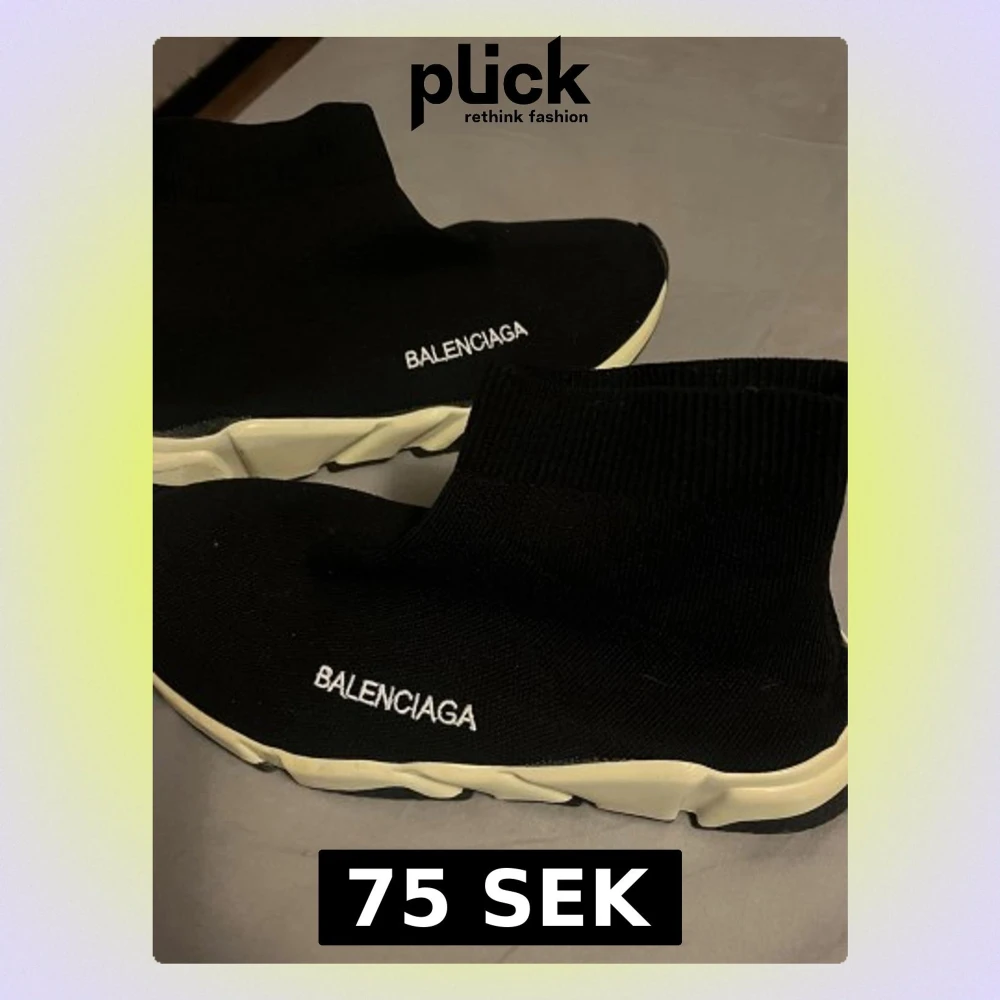Svarta sock sneakers med vit sula och broderad logga på sidan. Skorna har en stickad ovandel i syntetmaterial som sitter tight runt foten och en chunky, platt sula i vitt. Modern och clean design som är riktigt populär just nu. Passar både man och kvinna, storlek 39. Pull on modell.