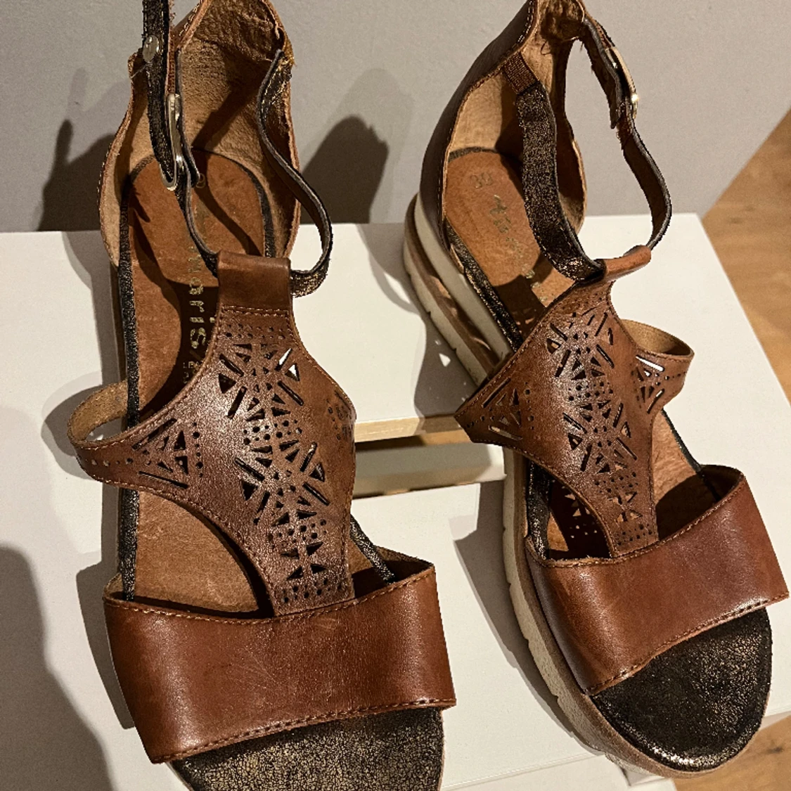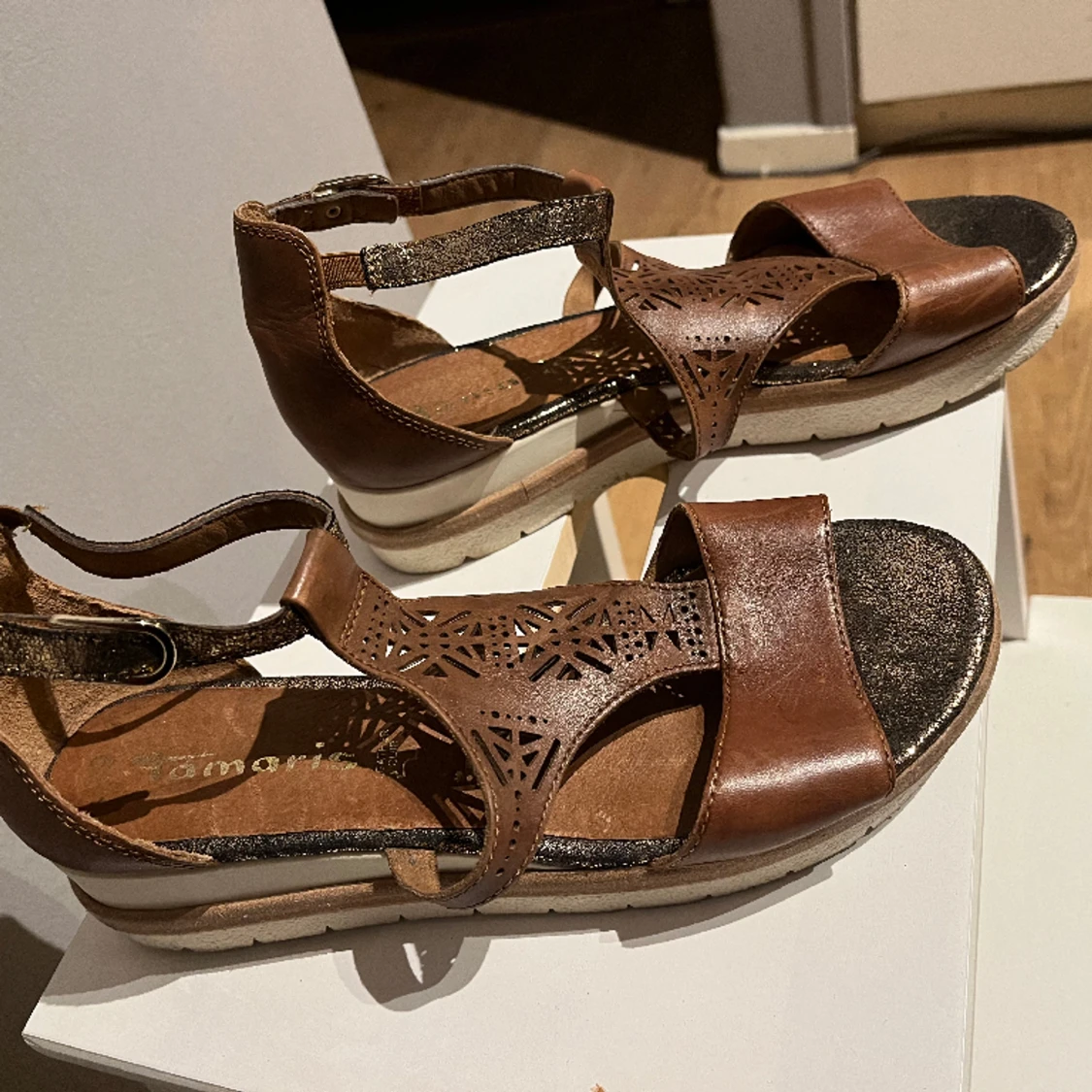 Storlek 39, använda en gång så är i fint skick. Sköna att gå i. Guldglittriga detaljer.