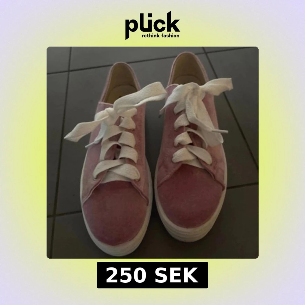 Snygga rosa sneakers med breda vita skosnören och platt vit sula. Skorna har en klassisk rund tå och är tillverkade i ett mjukt tygmaterial som ger en chill vibe. Perfekta för dig som gillar färg och vill sticka ut lite extra.